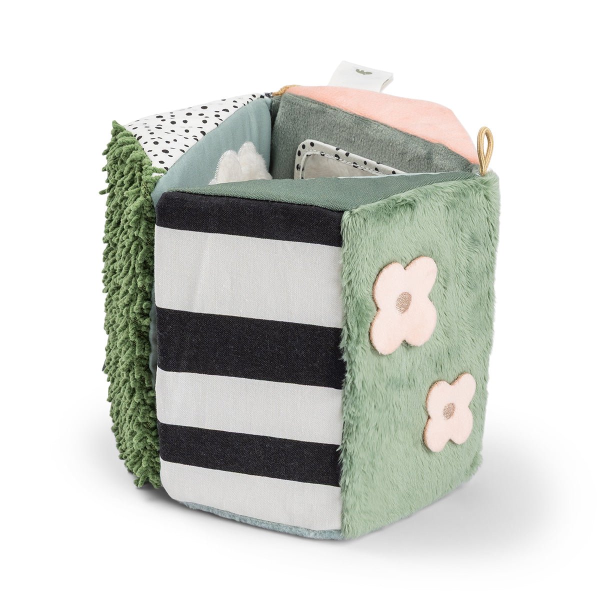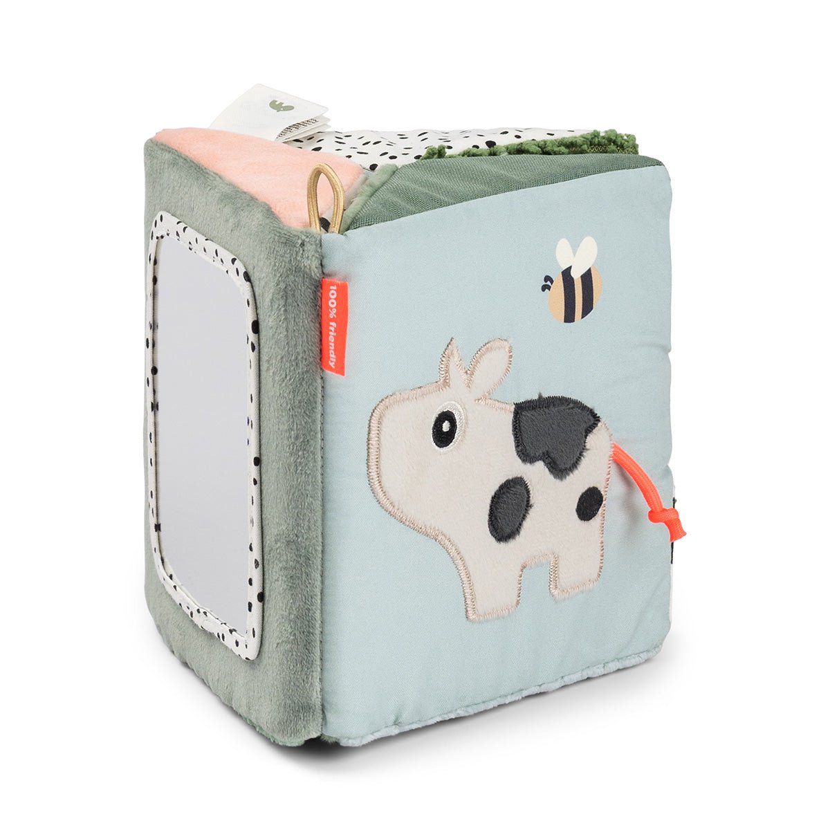 Ein zarter und verspielter Spiegel, der die Kleinen zum Schauen, Fühlen und Entdecken einlädt. Perfekt für die Bauchzeit, im Laufstall oder auf einer Spielmatte. Der Spiegel kann aufrecht stehen, heruntergeklappt oder aufgehängt werden, so dass du ihn überallhin mitnehmen kannst. Die fröhlichen Motive, die weichen Stoffe und der sichere Spiegel fördern die visuelle und sensorische Entwicklung.