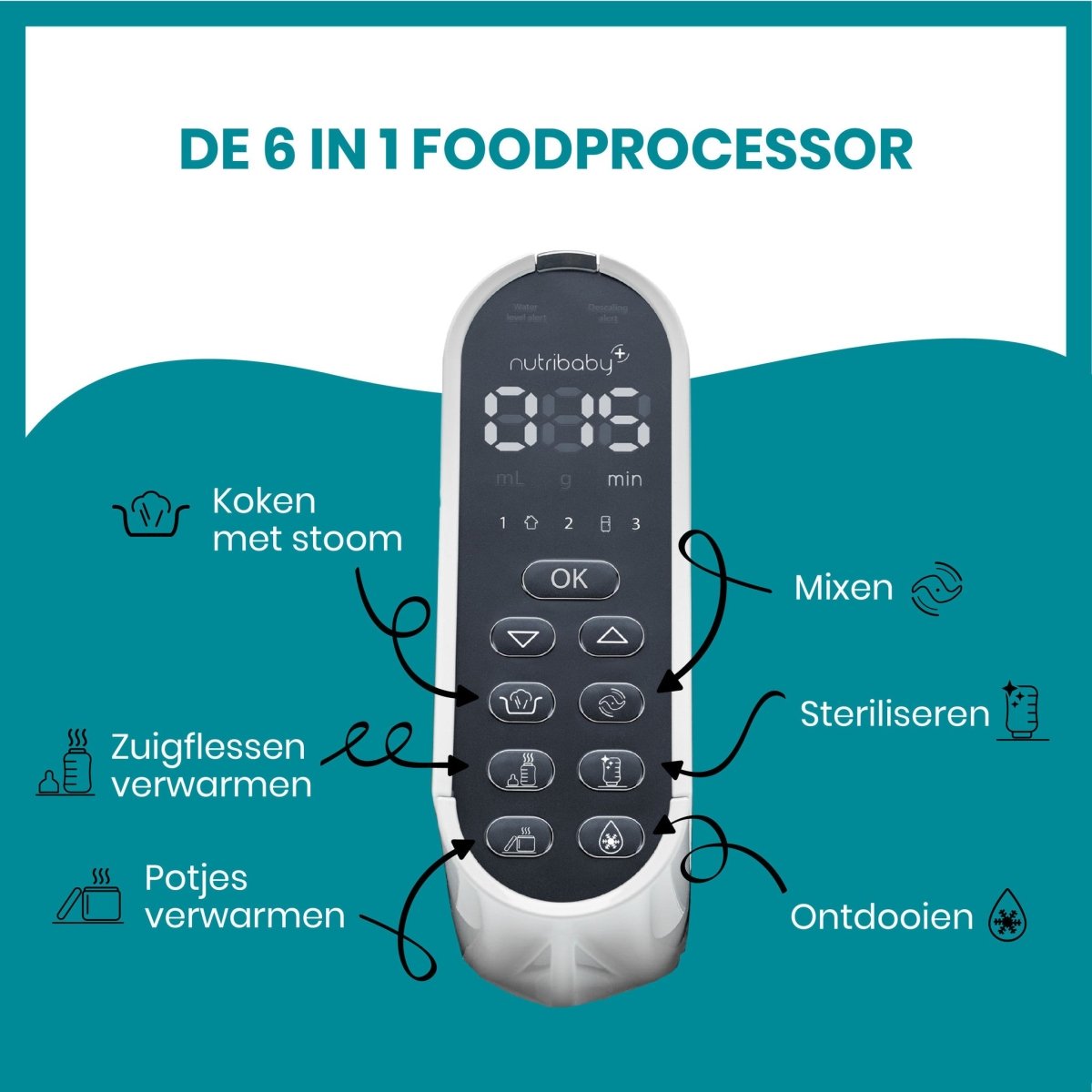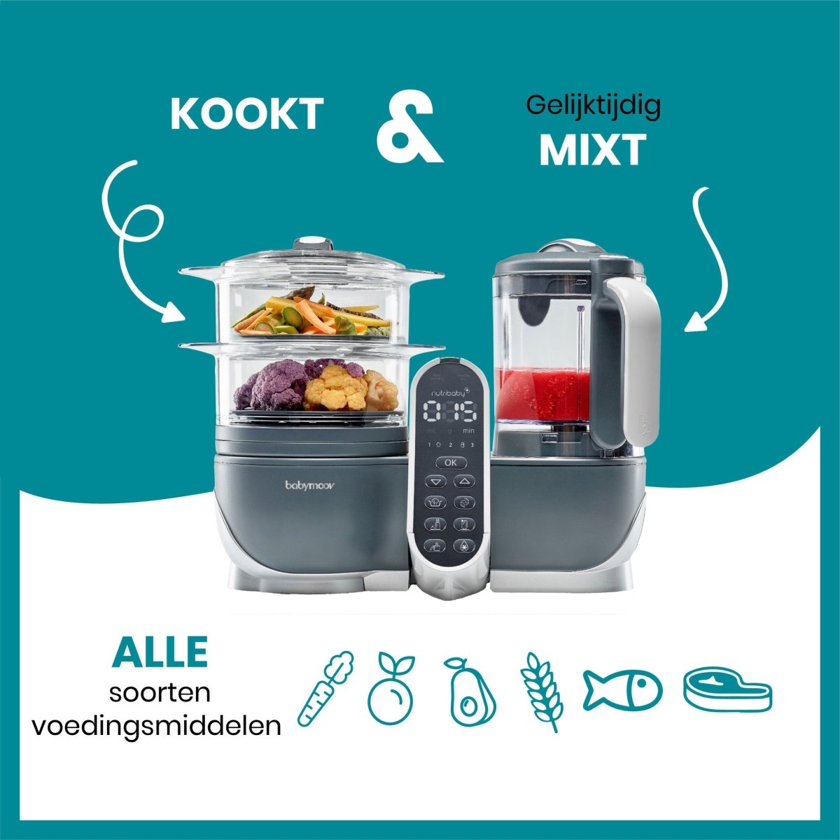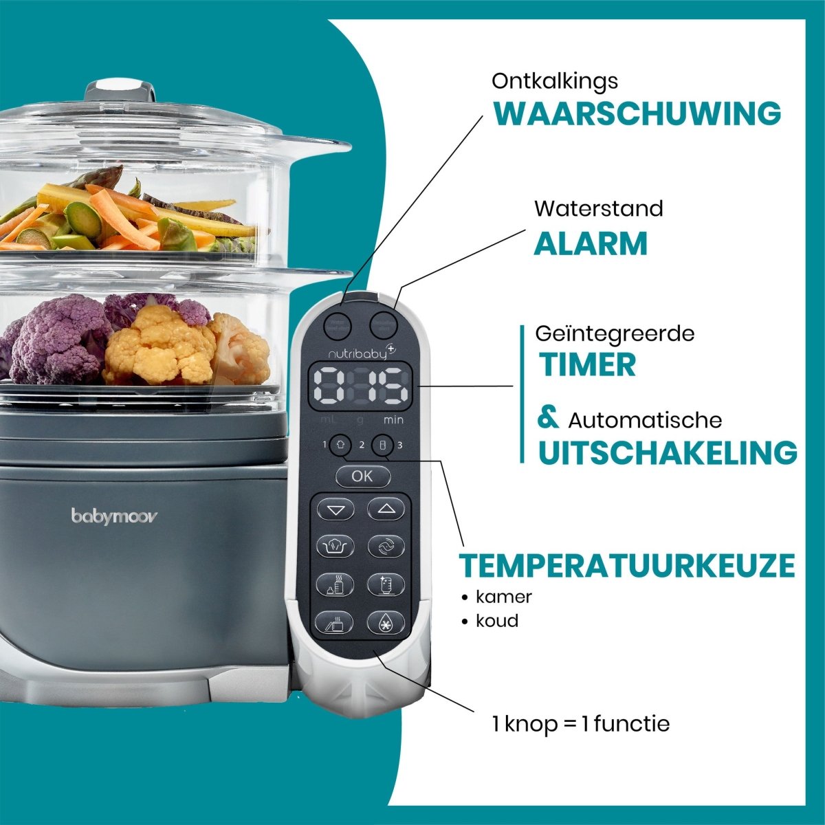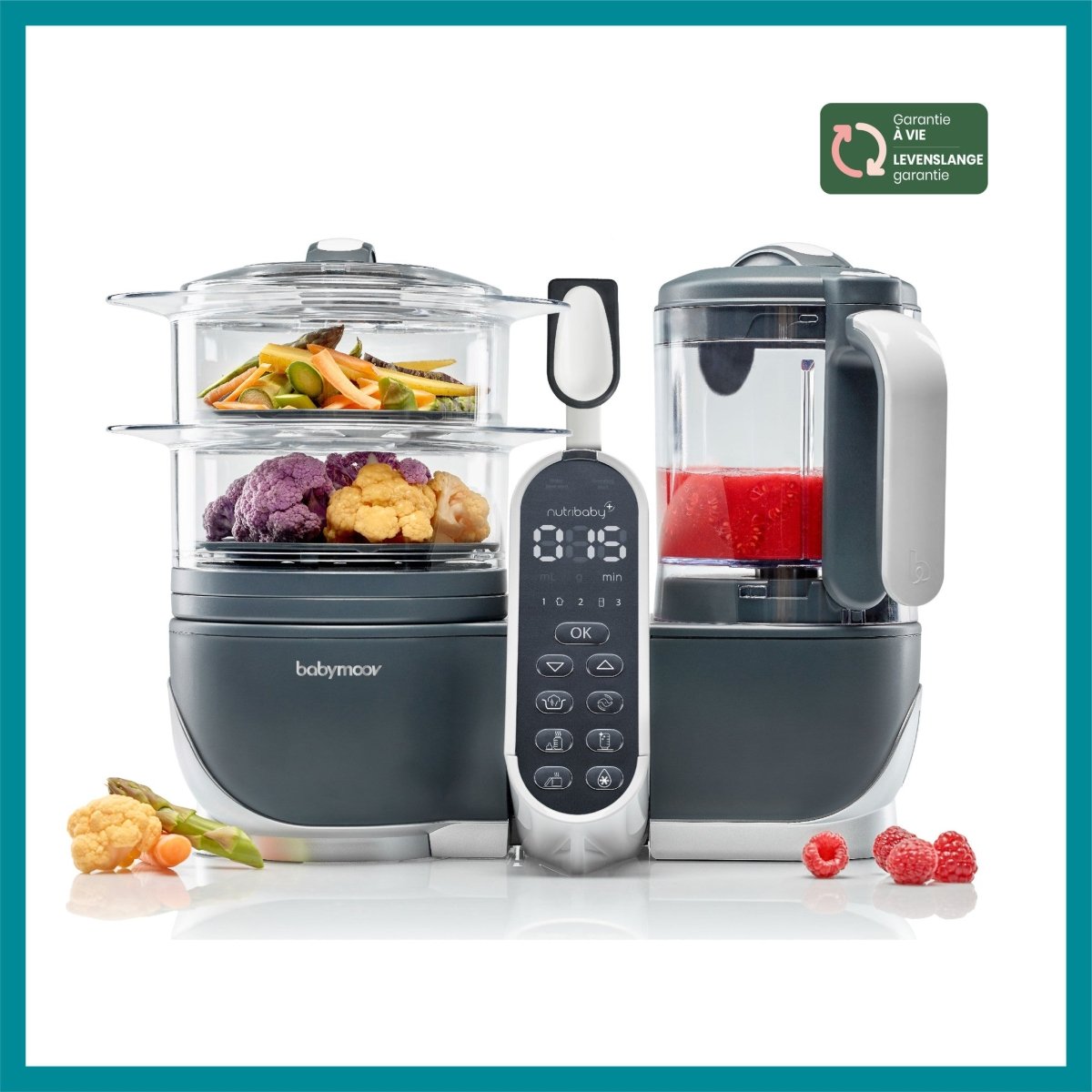 Mit seiner zentralen Konsole mit Touch-Display und 10 Automatikprogrammen wirst du erstaunt sein, wie einfach der Nutribaby(+) zu bedienen ist. 1 Taste = 1 Funktion. Vielseitig und mit einem XXL-Fassungsvermögen, zum Erhitzen und Sterilisieren von Babyflaschen sowie zum Dampfgaren, Mixen und Auftauen. In den 2 separaten Körben werden die Lebensmittel in der richtigen Garzeit perfekt gedämpft, wobei die natürlichen Aromen, Vitamine und Nährstoffe erhalten bleiben. Dank der 3 Mixergeschwindigkeiten in Kombination mit dem Auffangbehälter für die Kochflüssigkeit kannst du mühelos die gewünschte Konsistenz erreichen, um deinem Baby die nahrhaftesten Pürees zu servieren, und zwar in allen Phasen der Nahrungsvielfalt!