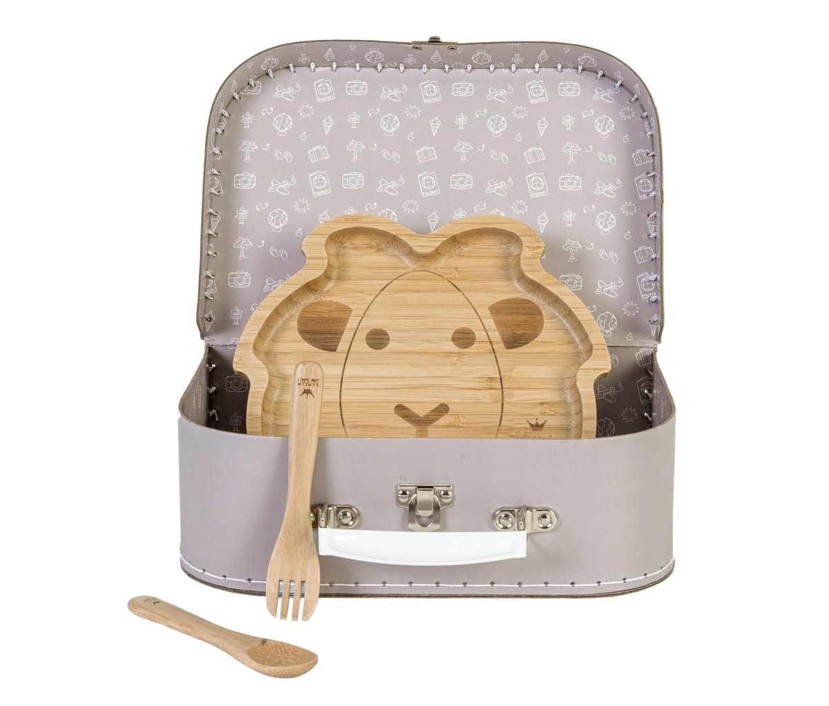Reise die Welt mit dem Koffer Fusion Time. In diesem Fall findest du einen Teller und Besteck aus orientalischem Bambus. Der Teller hat einen fröhlichen, robusten Löwenkopf und einen Saugnapf, der den Teller sicher auf dem Tisch hält.