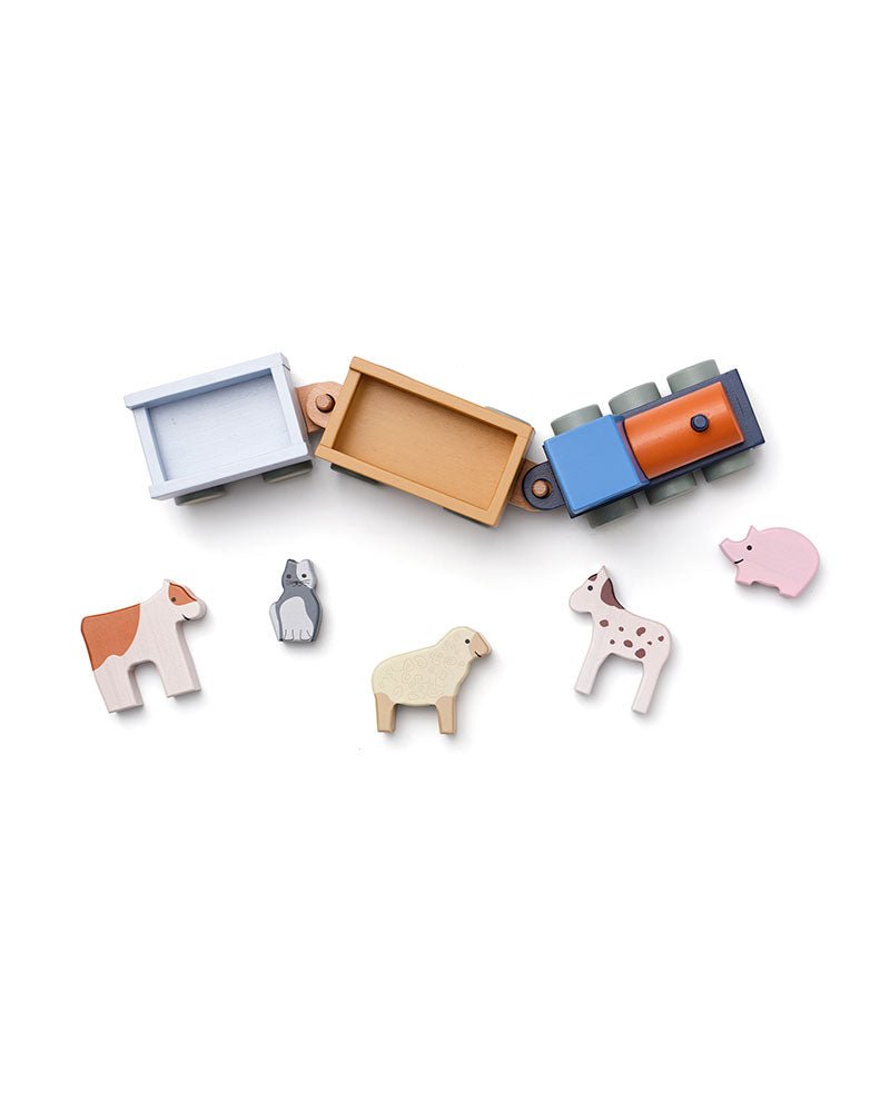 Alles einsteigen in den Bauernhofzug! Dieser charmante Holzzug kommt mit zwei Waggons und fünf liebenswerten Bauernhoftieren: Mira die Kuh, Max das Pferd, Poppy das Schwein, Bella das Schaf und Sture die Katze. Kinder können die Tiere in die Waggons laden und sich ihre eigenen Geschichten ausdenken, während sie den Zug schieben.