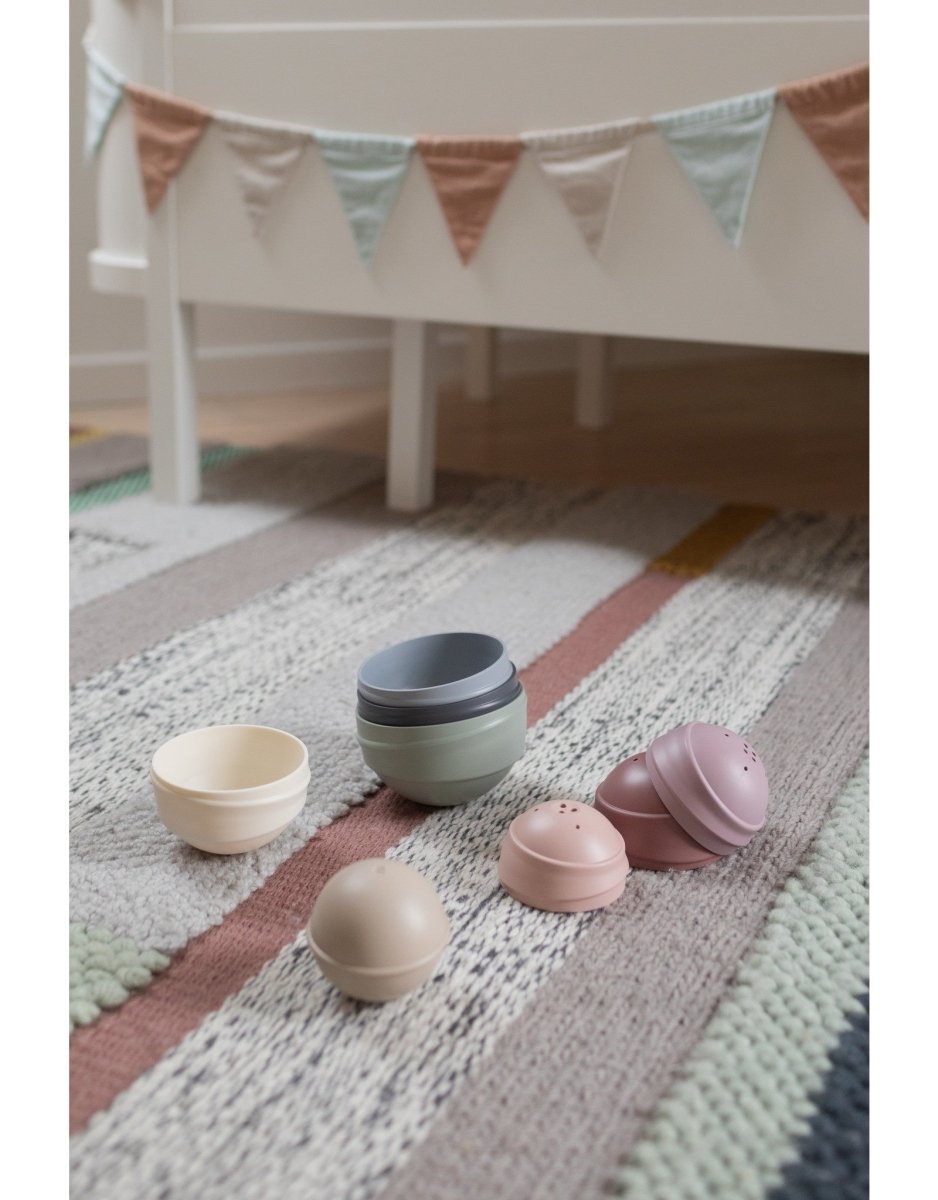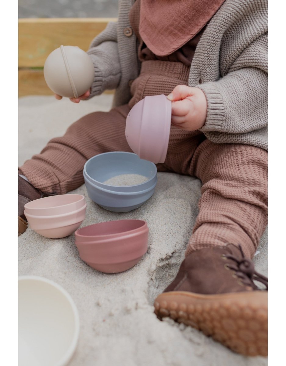 Produkt mit mehreren Funktionen, das sowohl zum Spielen mit Sand als auch mit Wasser anregt (außer dem Rasselball, der nicht ins Wasser passt)