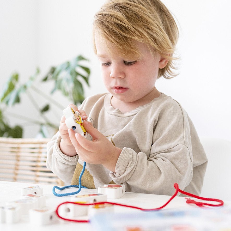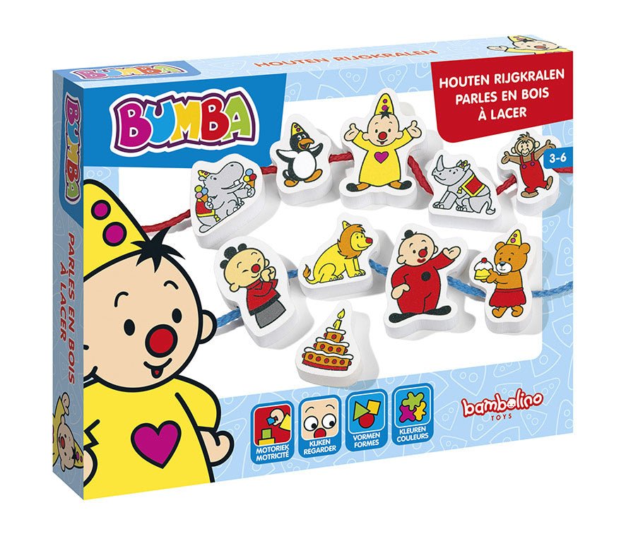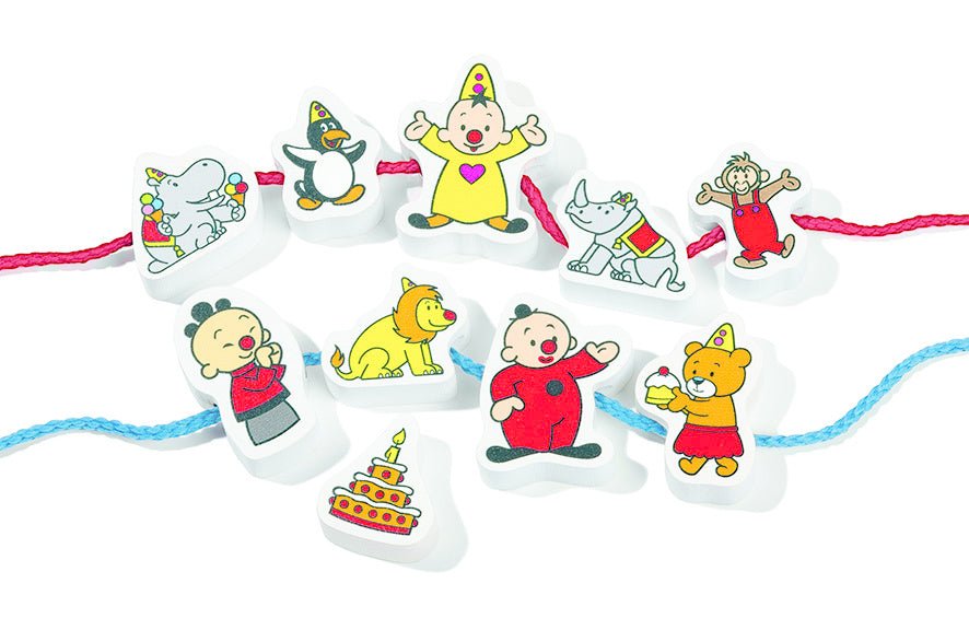 Set aus massiven Holzperlen zum Auffädeln mit Bildern von Bumba, Bumbalu und ihren Freunden. Die Perlen sind extra groß und haben eine breite Aussparung, damit kleine Hände sie leicht auf eine Schnur auffädeln können. Inklusive 2 Schnüre zum Auffädeln.