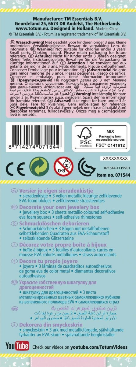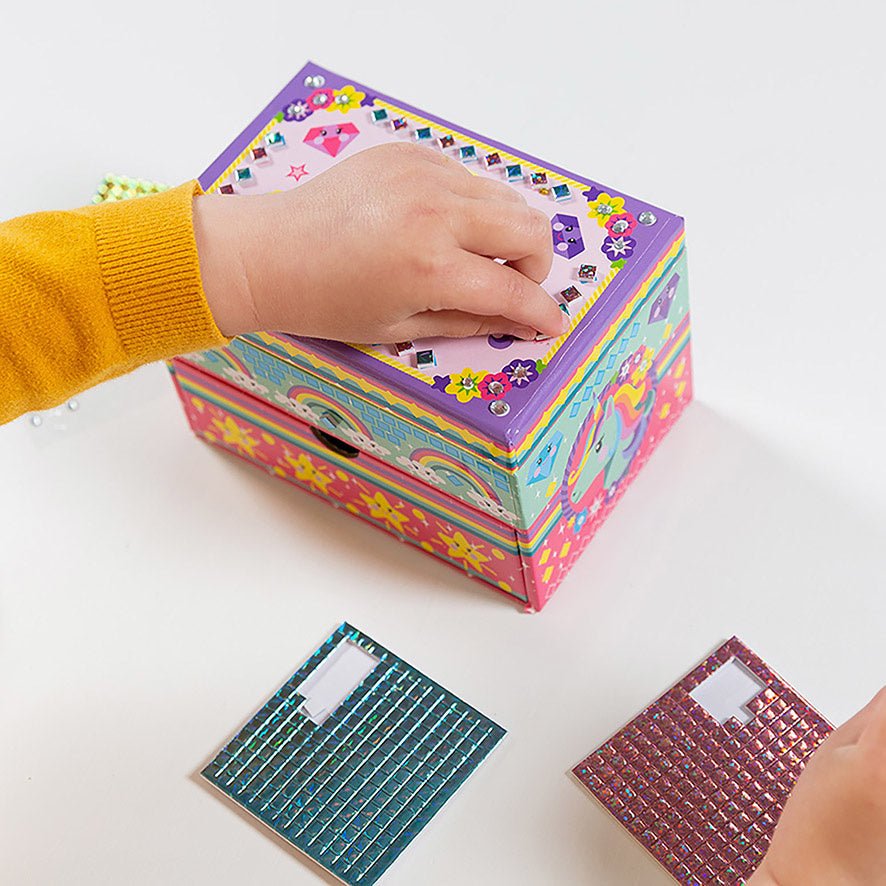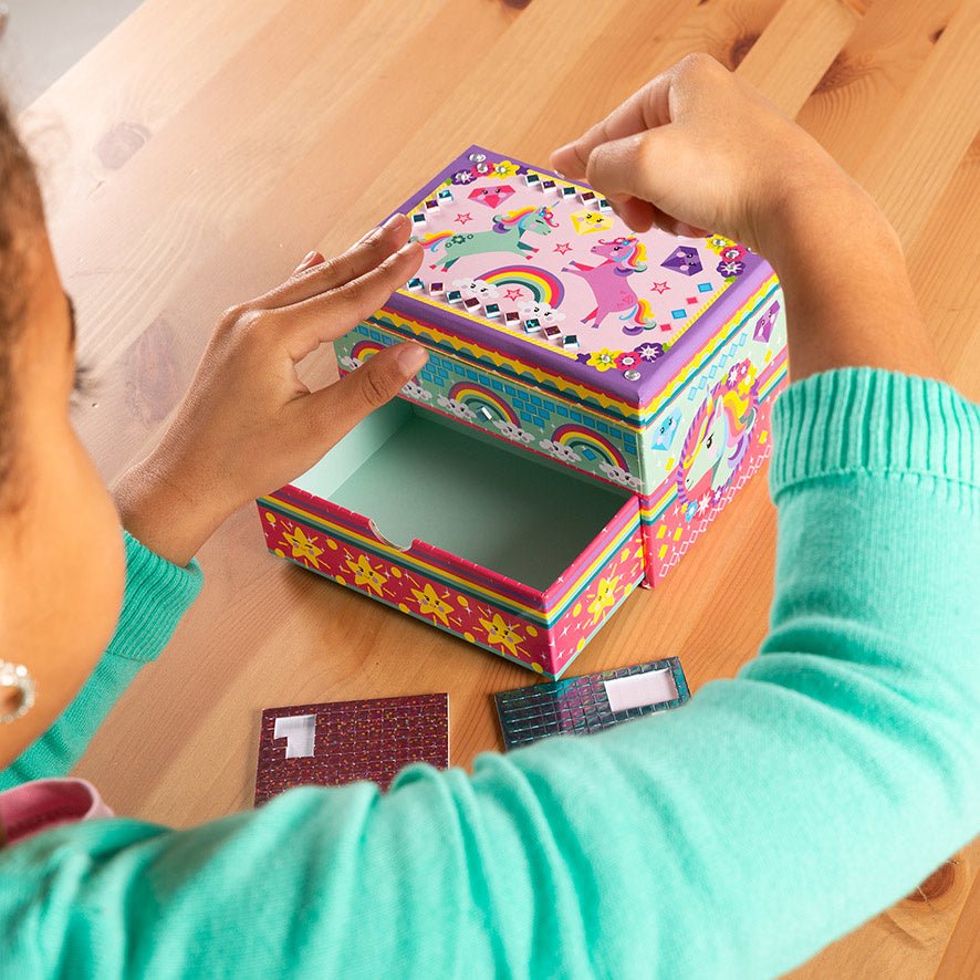 Dekoriere dein eigenes Schmuckkästchen. Diese Box hat ein fröhliches Einhornmotiv. Was an dieser Schmuckschatulle noch mehr Spaß macht: Du kannst entscheiden, wie sie aussehen soll! Bedecke die Box mit den selbstklebenden Metallschaumblöcken und selbstklebenden Strasssteinen. Jetzt hast du all deinen Schmuck zusammen in einer schönen selbstgemachten Schmuckschatulle.