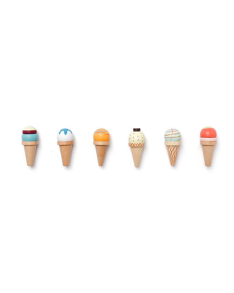 Genieße endlosen Spielspaß mit diesem Set aus sechs hölzernen Eistüten, jede mit einem einzigartigen Design, das Kinder zu fantasievollen Rollenspielen einlädt. Die Eistüten werden in einer praktischen Holzkiste mit Deckel geliefert, die mit sechs Öffnungen ausgestattet ist, damit alles ordentlich aufbewahrt werden kann. Kinder können gemeinsam mit Freunden und Familie in ihrer Spielküche oder am Eisstand "Eis verkaufen" und so ihre sozialen Fähigkeiten und ihre Fantasie fördern.
