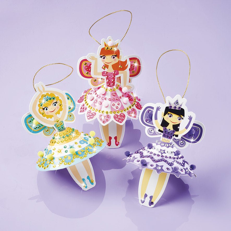 Verziere zuerst die Feen selbst mit Strasssteinen und vervollständige dann ihre Outfits, indem du auch die Röcke der Feen hübsch mit Strasssteinen und Pompons verzierst.