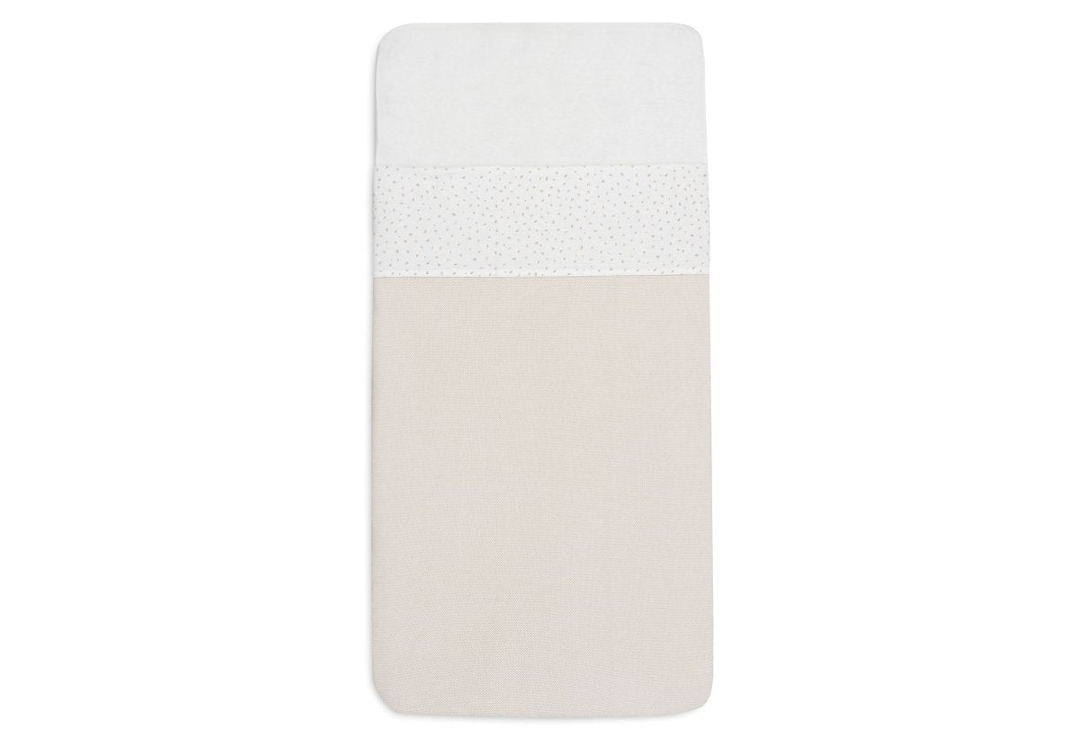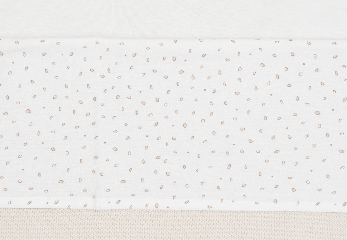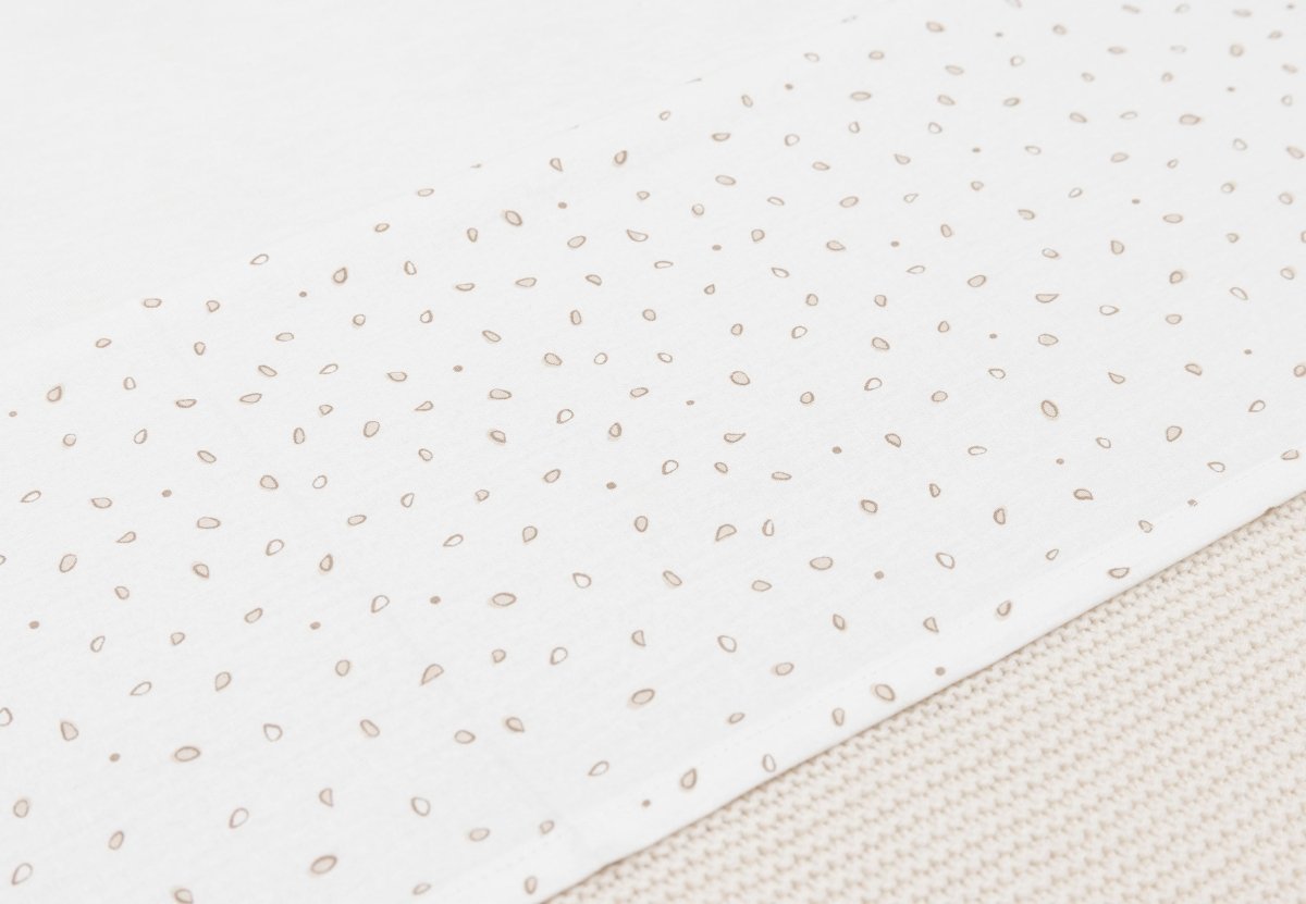 Dieses Betttuch hat einen elfenbeinfarbenen Hintergrund mit wunderschönen Blättern in den Farben Milky Coffee und Sand. Es passt perfekt zur Leafy Dreams Kollektion und verleiht dem Babyzimmer eine ruhige, natürliche Atmosphäre. Ein zeitloses Laken, das sich gut mit den niedlichen Decken in den Farben Sand und Milky Coffee aus dieser Kollektion kombinieren lässt.