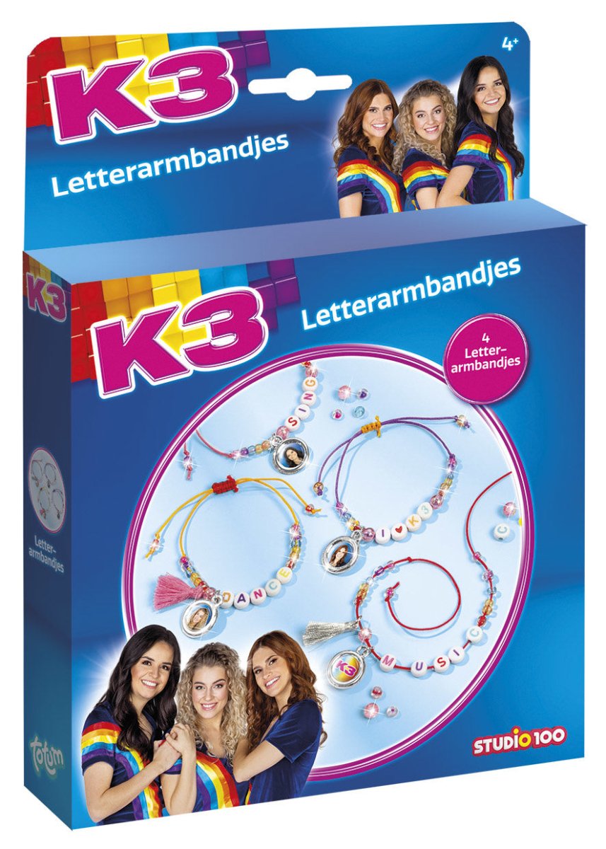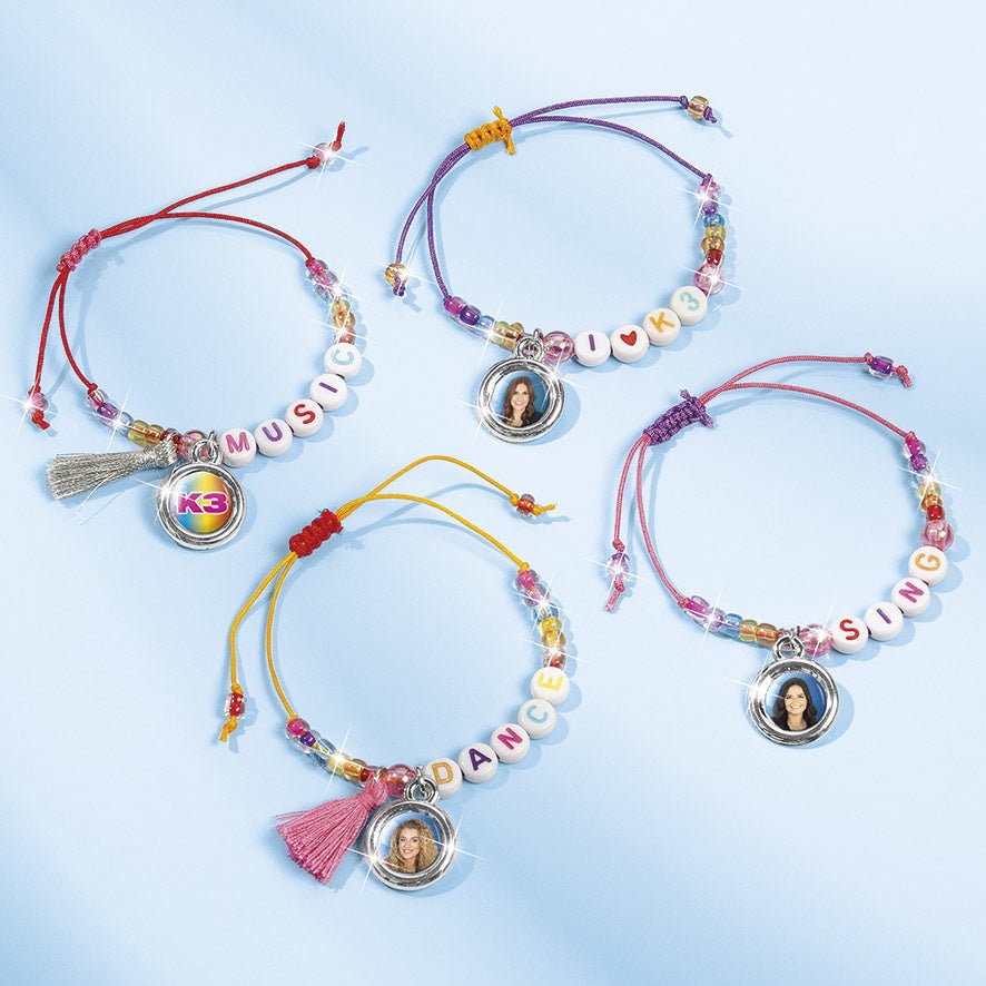 Mit diesem lustigen Schmuckset kannst du deine eigenen lustigen K3-Buchstabenarmbänder mit K3-Anhängern aus der neuesten Gruppe und K3-Buchstabenperlen herstellen. Viel Spaß nach den Studio 100 Shows und trage deinen Lieblings-K3-Star immer bei dir.
