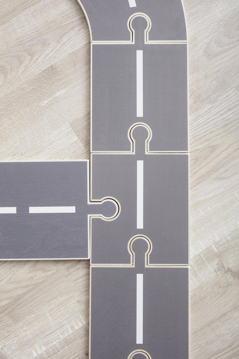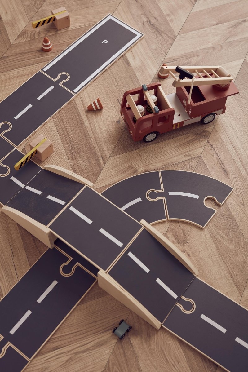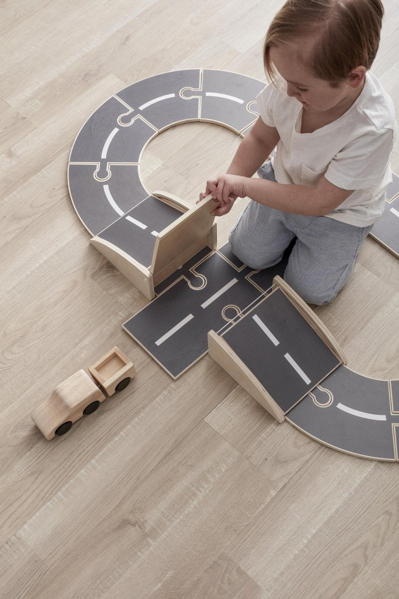 Toddlekind Große Holzautobahn mit einer zu öffnenden Brücke. Geeignet für unsere Aiden-Autos und -Busse. Kann auf verschiedene Arten zusammengebaut werden. 18 Teile. 74x110 cm aus Sperrholz.
