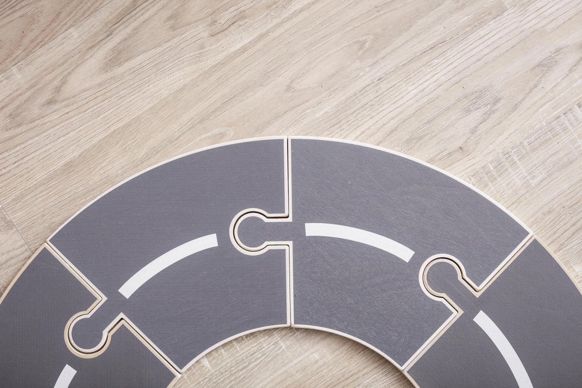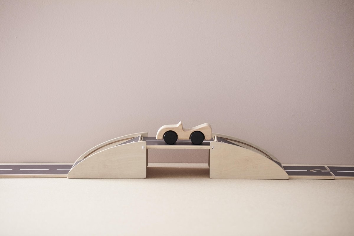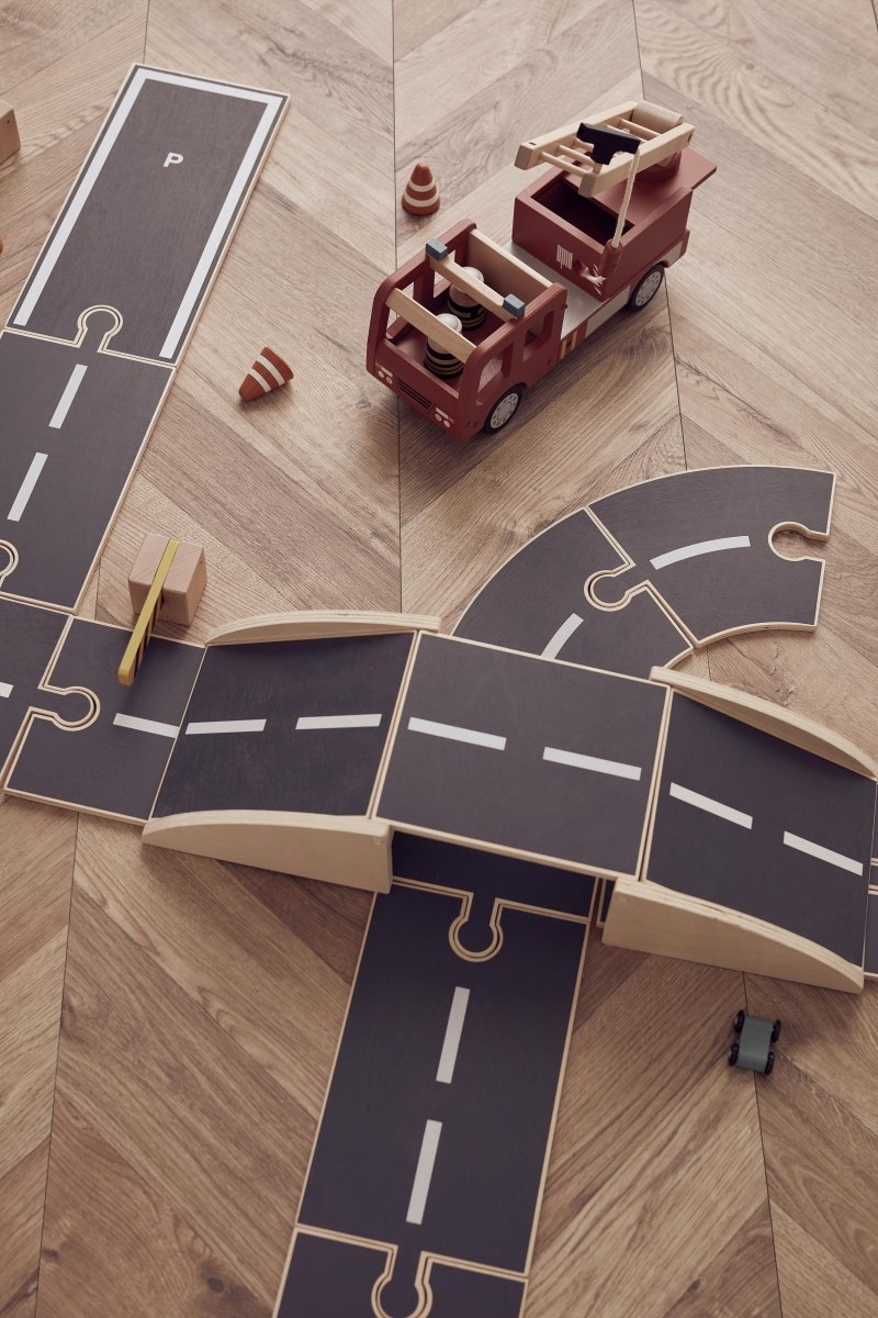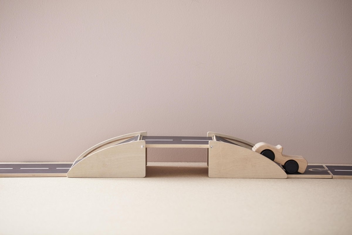 Toddlekind Große Holzautobahn mit einer zu öffnenden Brücke. Geeignet für unsere Aiden-Autos und -Busse. Kann auf verschiedene Arten zusammengebaut werden. 18 Teile. 74x110 cm aus Sperrholz.
