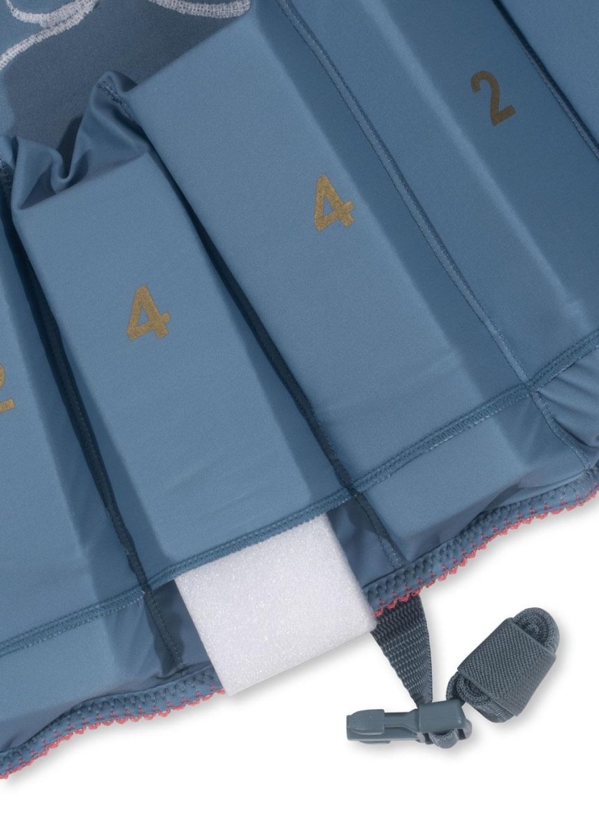 Unsere Schwimmwesten sind mit Schaumstoff-Auftriebsstäben auf der Innenseite ausgestattet, die an die Fähigkeiten und Bedürfnisse des Kindes angepasst werden können. Die Schwimmstäbe können leicht einzeln entfernt werden, während dein Kind seine Schwimmfähigkeiten entwickelt. Entferne die Stäbe immer paarweise, beginnend mit 1 & 1, dann 2 & 2 und so weiter, bis dein Kind vollständig an das selbstständige Schwimmen angepasst ist.