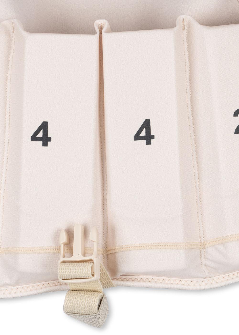 Unsere Schwimmwesten sind mit Schaumstoffauftriebskörpern auf der Innenseite ausgestattet, die an die Fähigkeiten und Bedürfnisse des Kindes angepasst werden können. Die Schwimmstäbe können leicht einzeln entfernt werden, während dein Kind seine Schwimmfähigkeiten entwickelt. Entferne die Stäbe immer paarweise, beginnend mit 1 & 1, dann 2 & 2 und so weiter, bis dein Kind vollständig an das selbstständige Schwimmen angepasst ist.