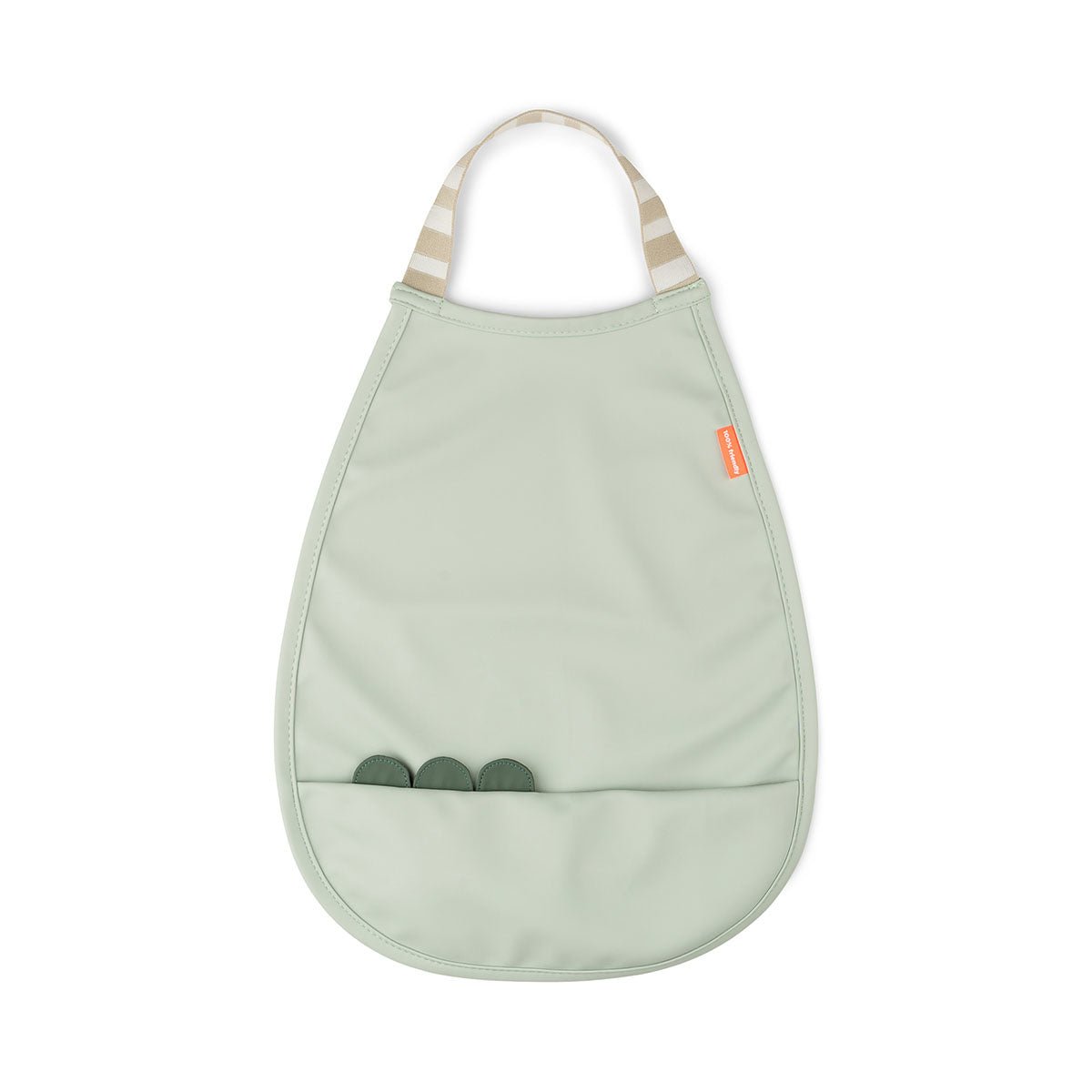 Das niedliche Lätzchen in Grün hat süße Krokodilschuppen, die aus dem Beutel herausragen und ein gestreiftes Gummiband.