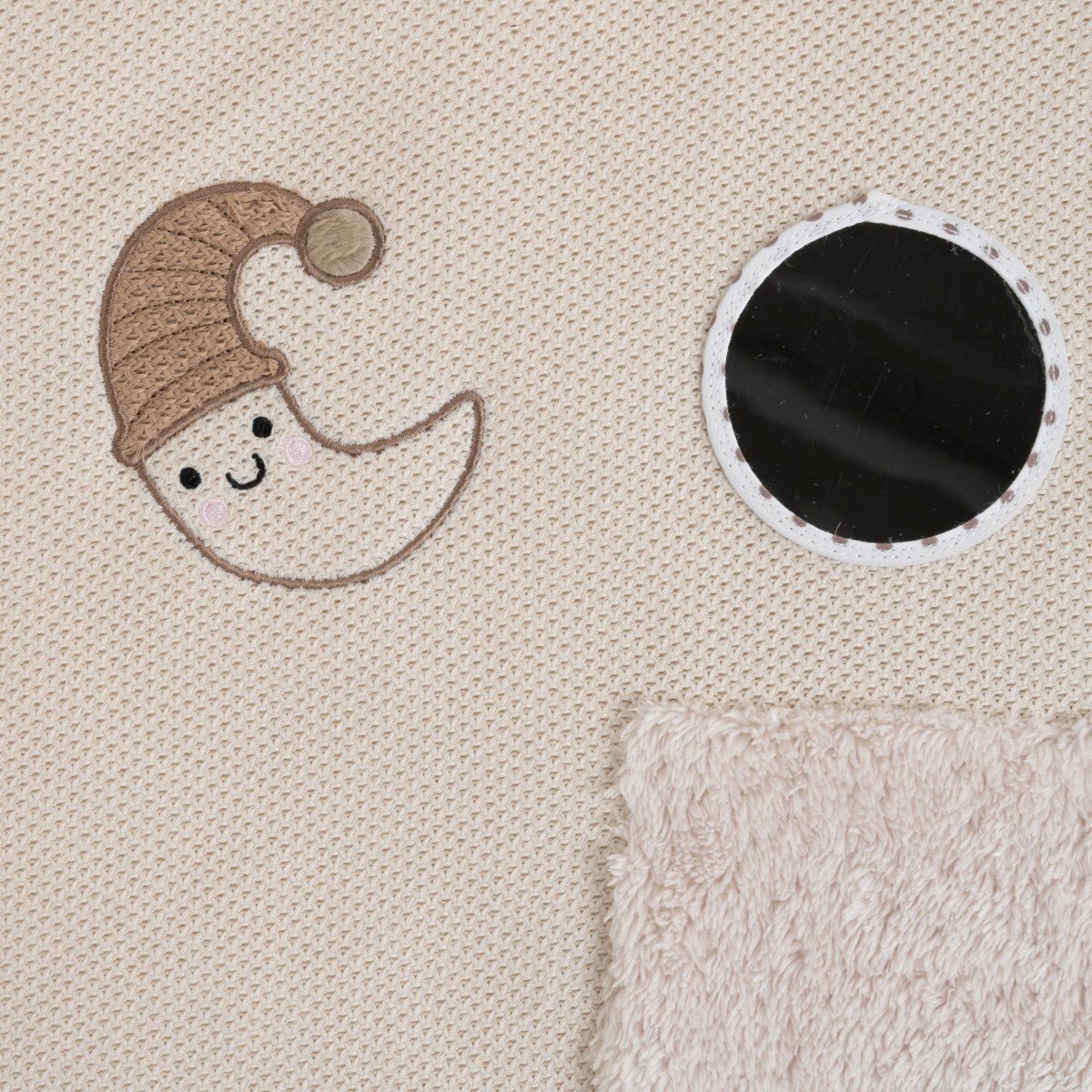 Die erkennbaren Mond-, Stern- und Wolken Figuren wurden subtil und spielerisch in das Design eingearbeitet. Sie wecken die Neugierde deines Babys und regen die Sinne durch Schauen und Fühlen an. In der Mitte befindet sich ein babysicherer Spiegel, der zum Staunen anregt und die erste Begegnung mit dem eigenen Spiegelbild ermöglicht.