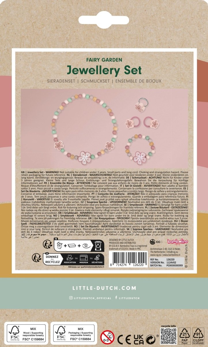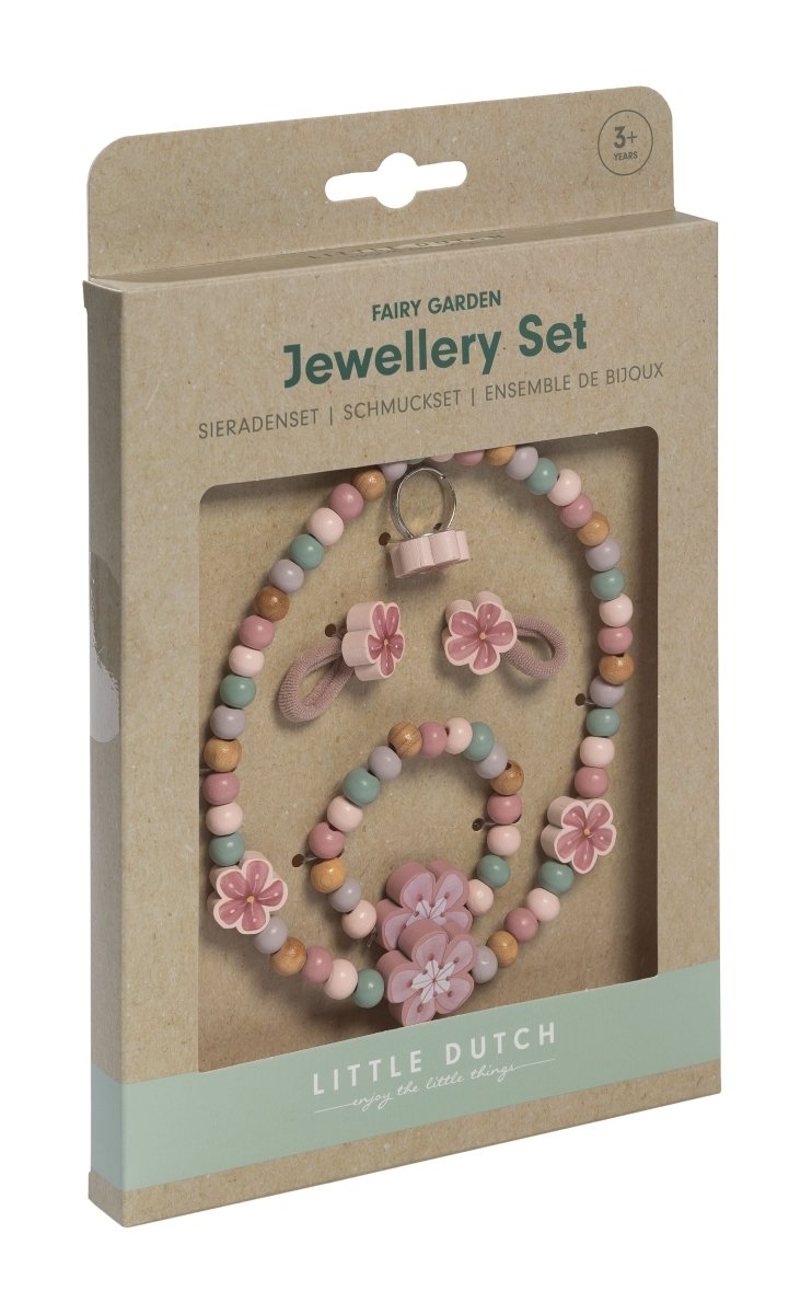 Ein süßes und farbenfrohes Schmuckset von Little Dutch, perfekt für kleine Mädchen, die Blumen und Accessoires lieben. Ideal als Geschenk in der mitgelieferten Geschenkbox. Inhalt des Sets: 1 Halskette 1 Armband 2 Haarspangen mit floralem Muster 1 zusätzliches Accessoire (mit Blumenmotiv) Kenmerken: Alle Perlen und Figuren sind aus Holz Verpackt in einer schönen Geschenkbox Stimuliert die Fantasie und das Rollenspiel Geeignet für Kinder ab 3 Jahren