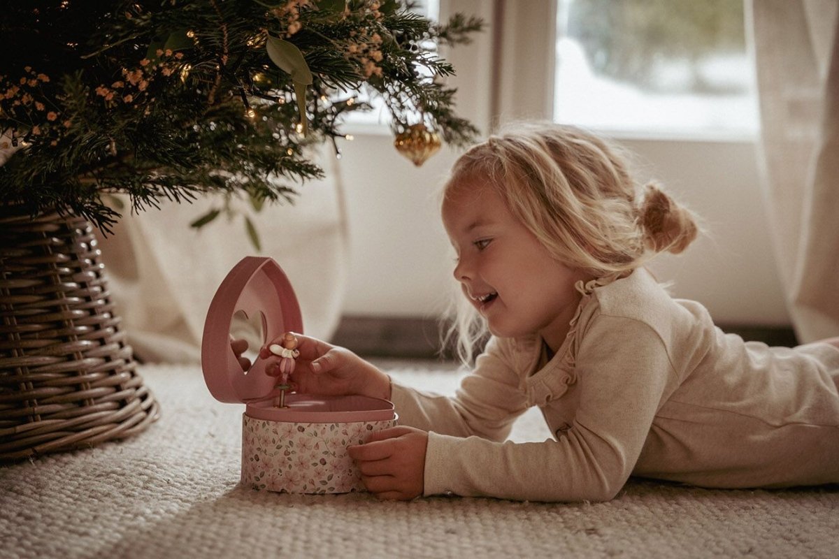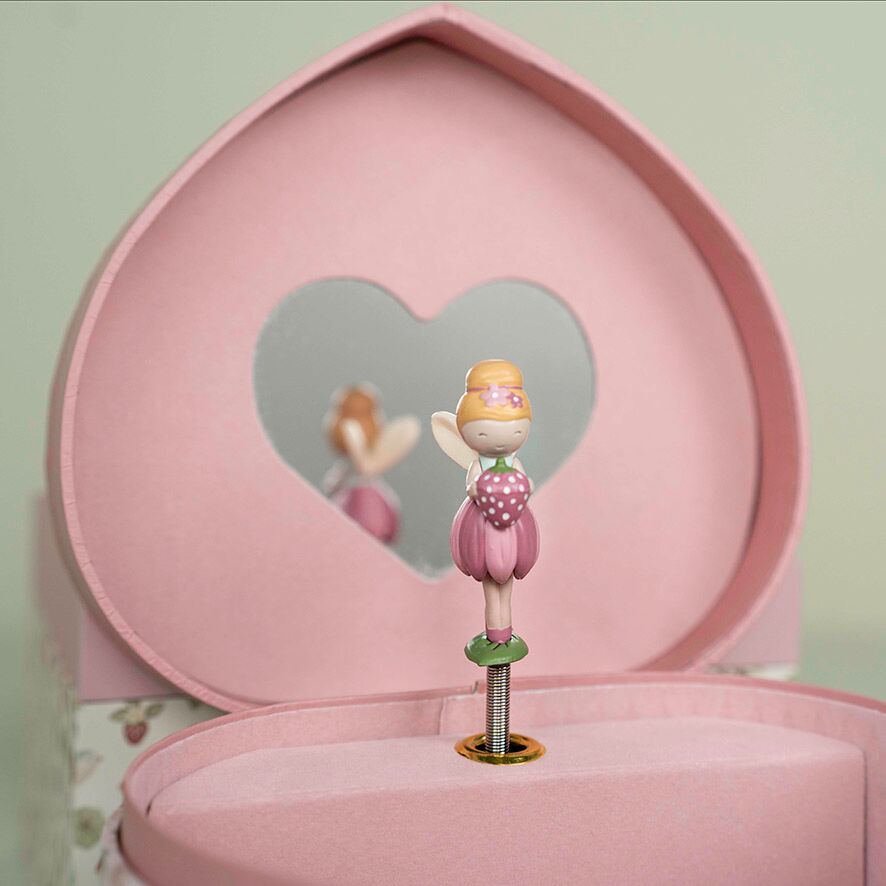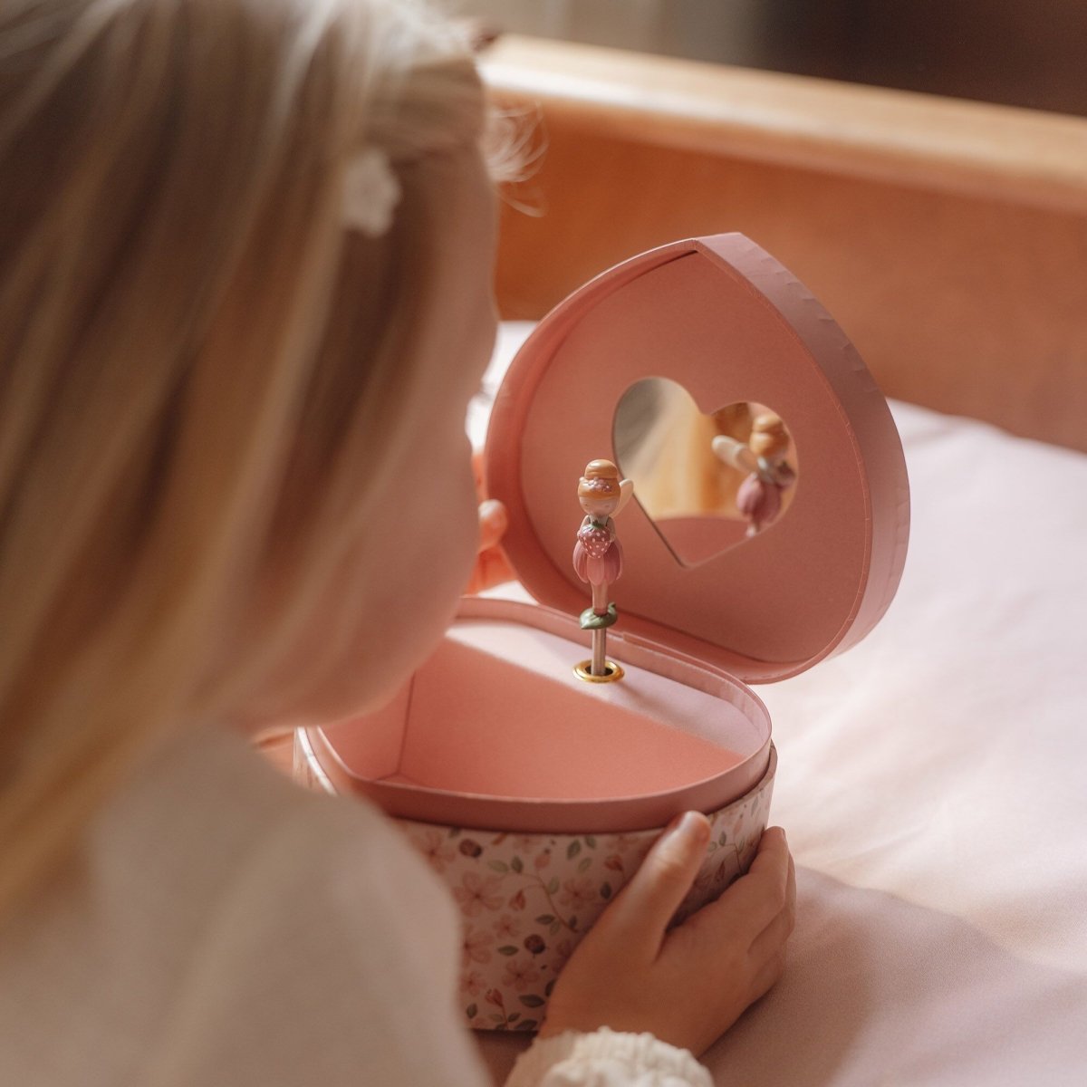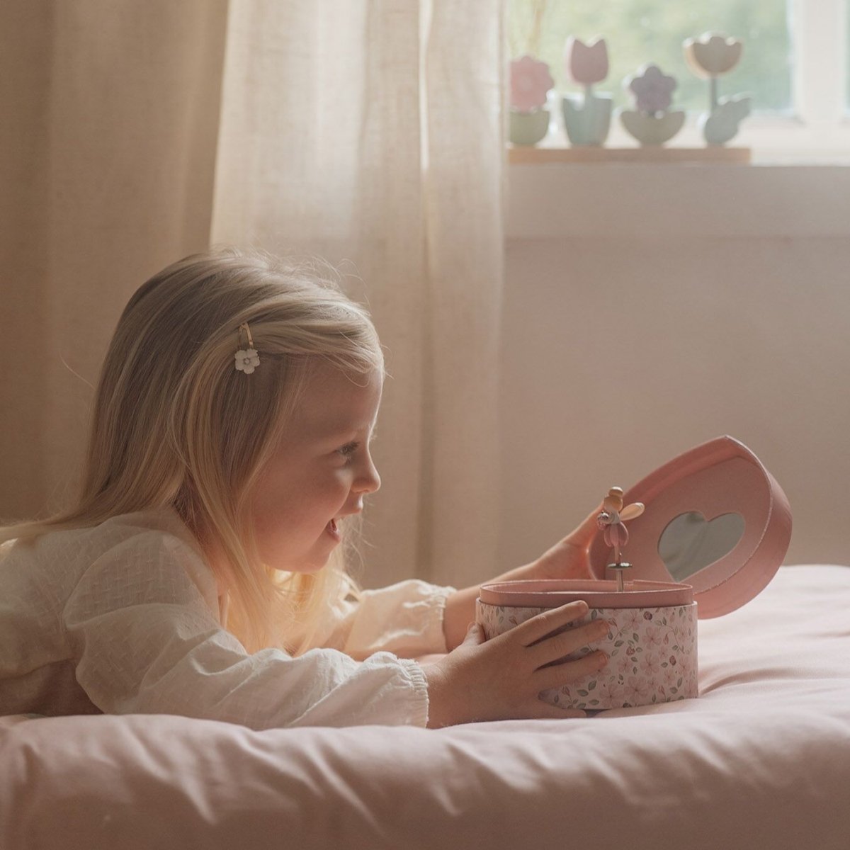 Betritt eine Welt der Verzauberung mit der Little Dutch Schmuckschatulle mit Musik. Diese farbenfrohe Box bietet genug Platz für die schönsten Schmuckstücke und Schätze. Wenn das Kästchen geöffnet wird, spielt Musik, während eine Fee vor dem Spiegel tanzt. Funktioniert ohne Batterien, der Musikmechanismus wird mit dem Schlüssel auf der Rückseite der Box aufgedreht. Ein wertvoller Gegenstand, der die Sinne deines Kindes anregt und inspiriert.