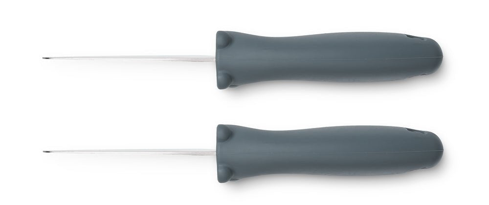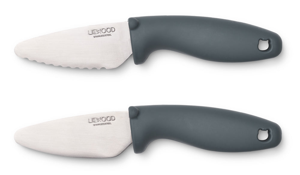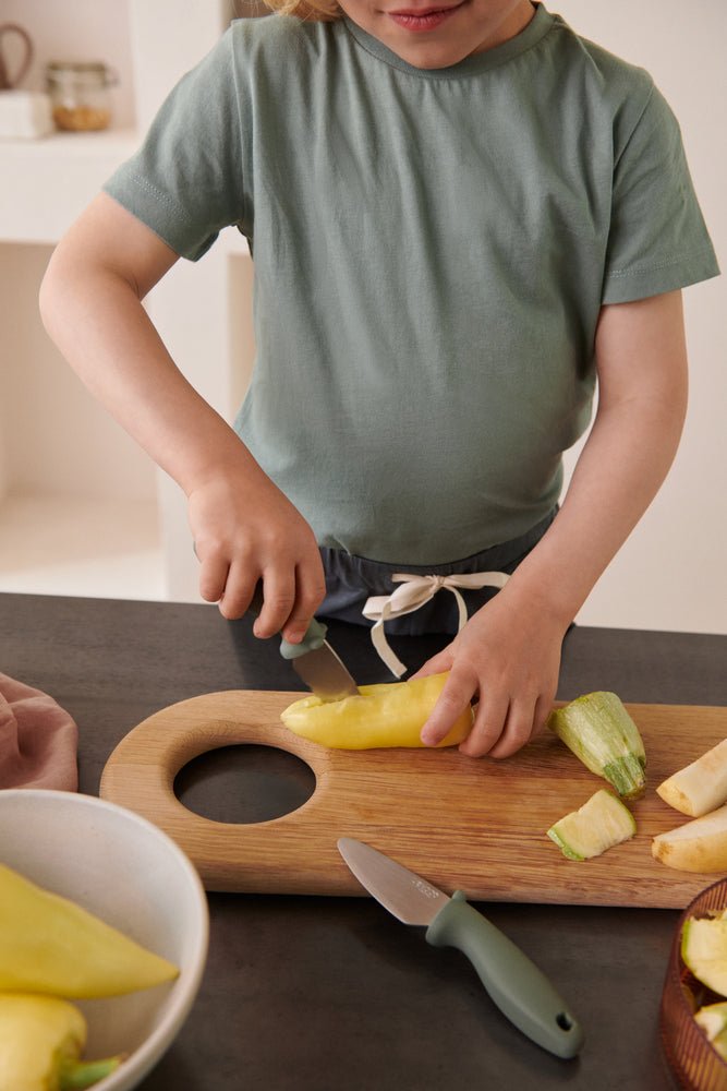 Schneidemesserset für Kinder. Damit die Kleinen Selbstvertrauen in der Küche gewinnen. Enthält ein Set mit zwei kinderfreundlichen Messern. Konzipiert für ältere Kinder. Empfohlenes Alter: 5-7 Jahre, abhängig von den Fähigkeiten des Kindes. Die Beaufsichtigung durch einen Erwachsenen ist notwendig. Spülmaschinenfest