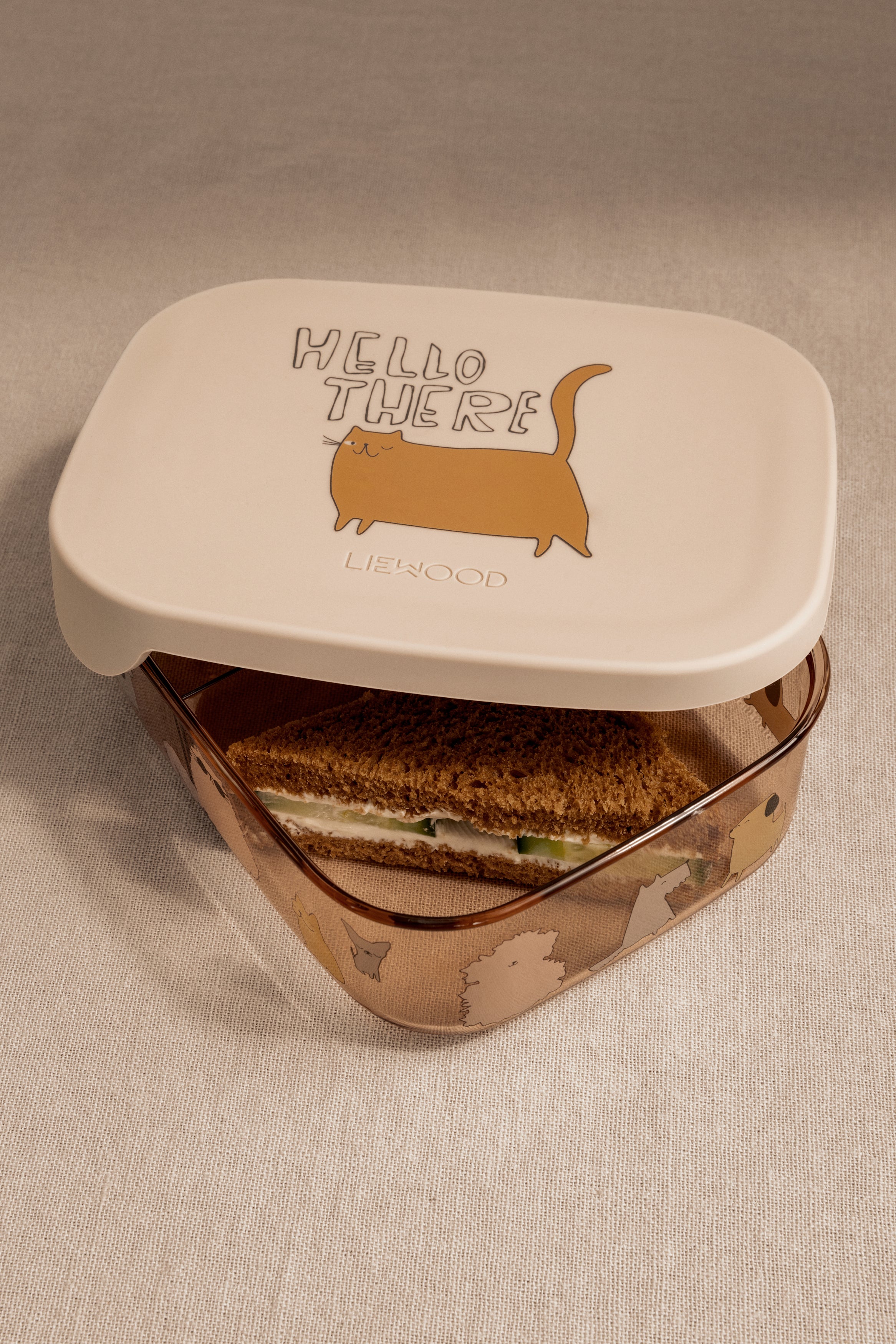 Durchsichtige Tritan-Lunchbox mit einem flexiblen Silikondeckel, der mit verspielten Prints verziert ist