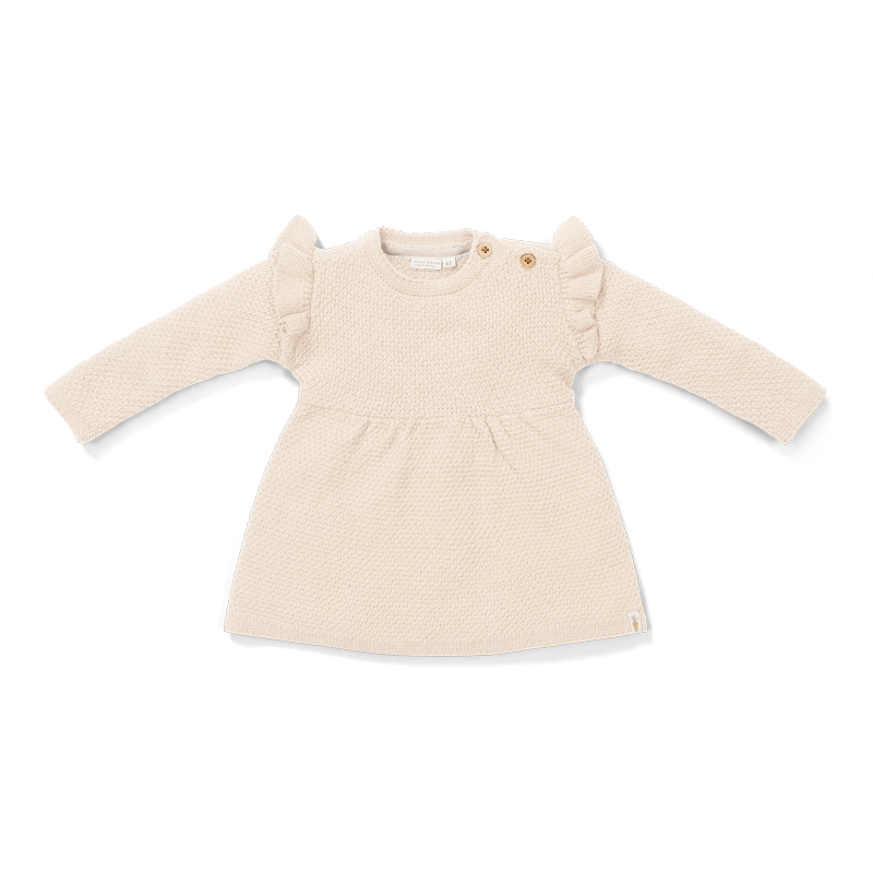 Zieh dein hübschestes Kleid an! Dieses weiche, sandfarbene Strickkleid mit Rüschen ist das perfekte Outfit für deine Kleine. Das Kleid ist aus herrlich weicher Baumwolle und hat Knöpfe an einer Schulter für ein einfaches An- und Ausziehen. Das Kleid hat Etiketten mit dem Little Dutch -Logo und dem Karottensymbol. Kombiniere das Kleid mit der Strumpfhose Sand und den Baby Bunny Babyschuhen. Erhältlich in den Größen 50, 56, 62, 68 und 74. Maschinenwäsche bei 30 Grad, Schonwaschgang; Bügeln bei niedriger Temperatur; nicht chemisch reinigen; nicht bleichen; nicht im Trockner trocknen.