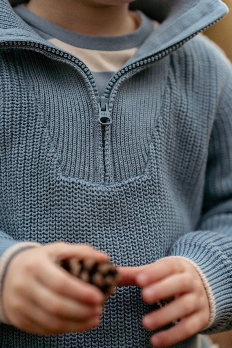 Warmer Strickpullover, Kragen mit Reißverschluss, Kontraststreifen unten und an den Ärmeln, aus Bio-Baumwolle, Ökotex zertifiziert. 100% Bio-Baumwolle