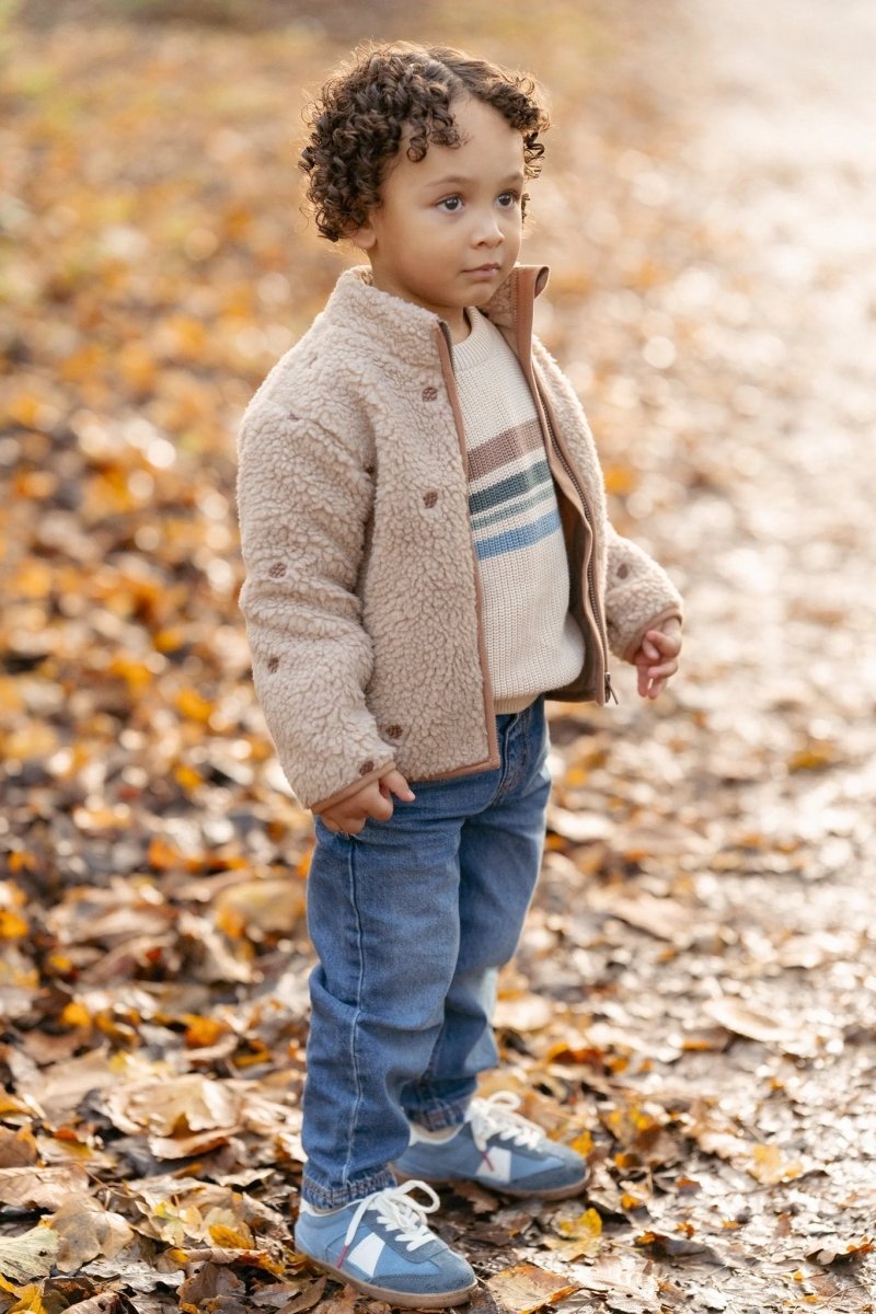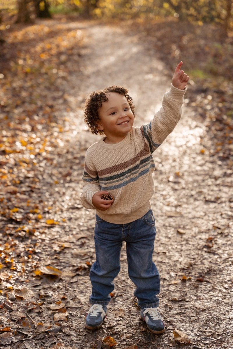 Dieser warme Strickpulli ist aus 100% Bio-Baumwolle und fühlt sich weich und bequem an. Die Vorderseite ist mit bunten Streifen verziert, die für einen fröhlichen und verspielten Look sorgen, während die unifarbene Rückseite den Pullover vielseitig und einfach mit Hosen aller Farben kombinierbar macht. Dank der Öko-Tex-Zertifizierung ist er eine verantwortungsvolle und hautfreundliche Wahl.