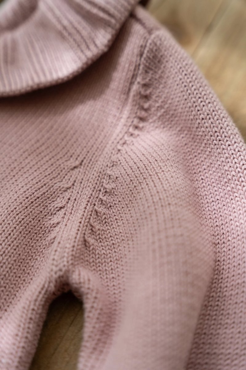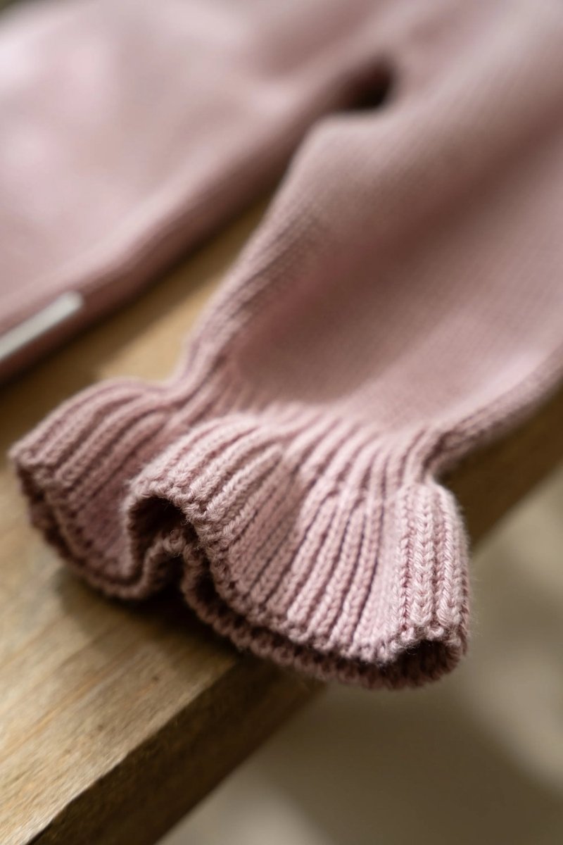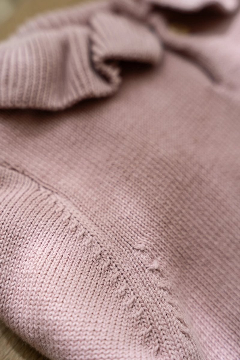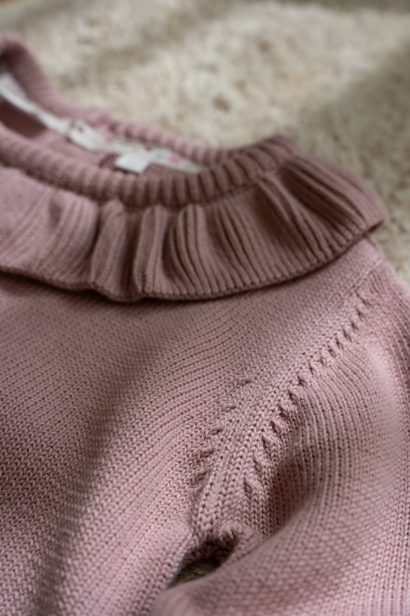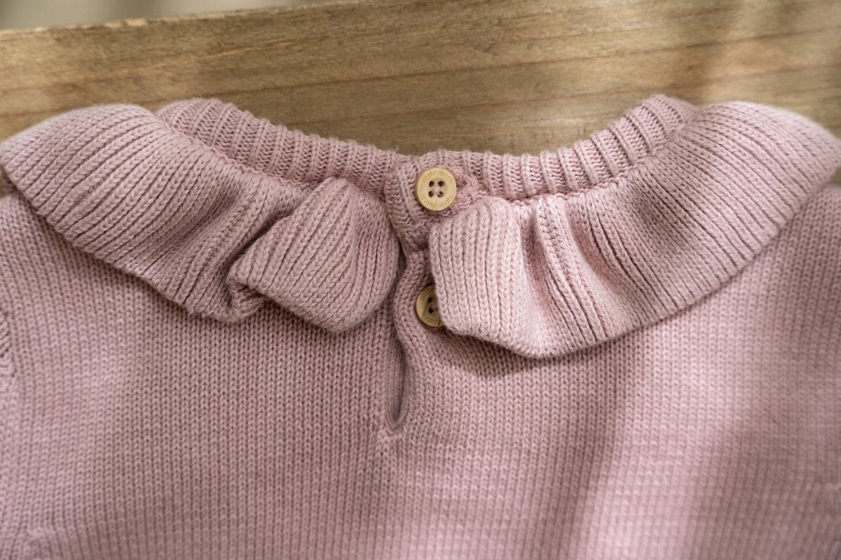 Warmer Strickpullover, melange hellrosa Farbe, Rüsche am Hals und an den Ärmeln, aus Bio-Baumwolle und Ökotex zertifiziert. 100% Bio-Baumwolle.