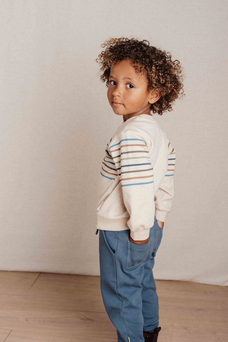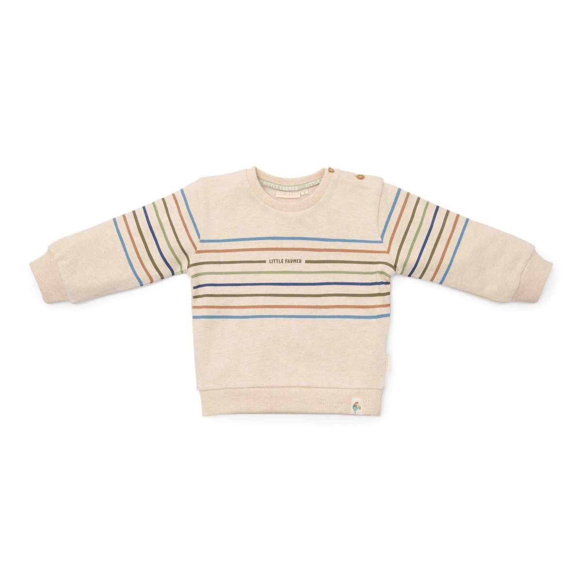 Streifen für Komfort und Stil! Dieser Pullover in einer Melange-Farbe kombiniert Wärme mit lässigem Stil. Hergestellt aus Bio-Baumwolle mit einer extraweichen Innenseite, bietet dieser Pullover Komfort an kühleren Tagen. Die Streifen in Erdtönen erinnern an die Farben auf dem Bauernhof und verleihen dem Outfit deines Kindes einen verspielten Touch. Der Pullover lässt sich nahtlos mit allen Artikeln aus der Farm-Kollektion kombinieren, so dass du von Kopf bis Fuß gestylt bist. Erhältlich in den Größen 74, 80, 86, 92, 98 und 104.