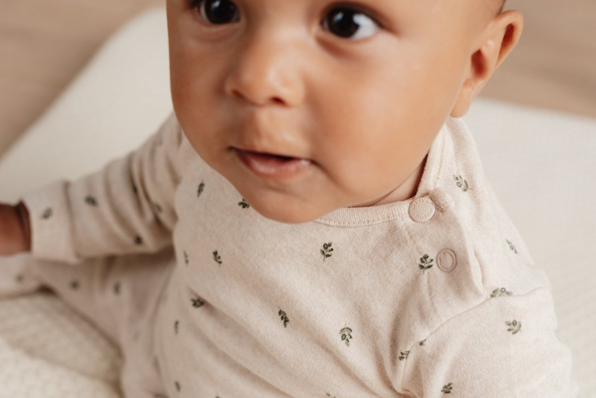 Bedeckt mit grünen Blättern! Dieses langärmelige T-Shirt hat einen bezaubernden Allover-Druck mit kleinen grünen Blättern. Es ist aus weicher Bio-Baumwolle in einer dezenten Melange-Farbe gefertigt und sorgt den ganzen Tag über für Komfort. Es hat zwei Druckknöpfe an der Schulter, die das Anziehen für Baby und Eltern erleichtern. Kombiniere sie mit der passenden Hose oder mit allen Artikeln aus der koordinierten Little Farm Kollektion. Erhältlich in den Größen 44, 50, 56, 62, 68 und 74.