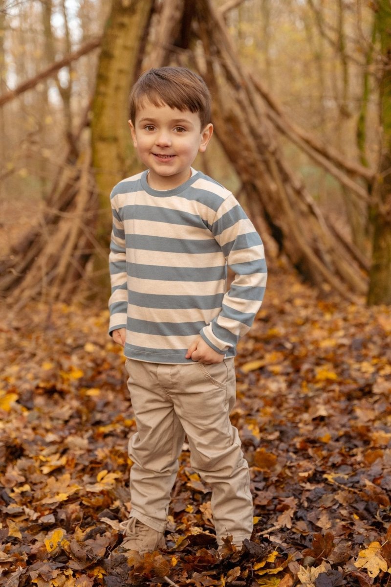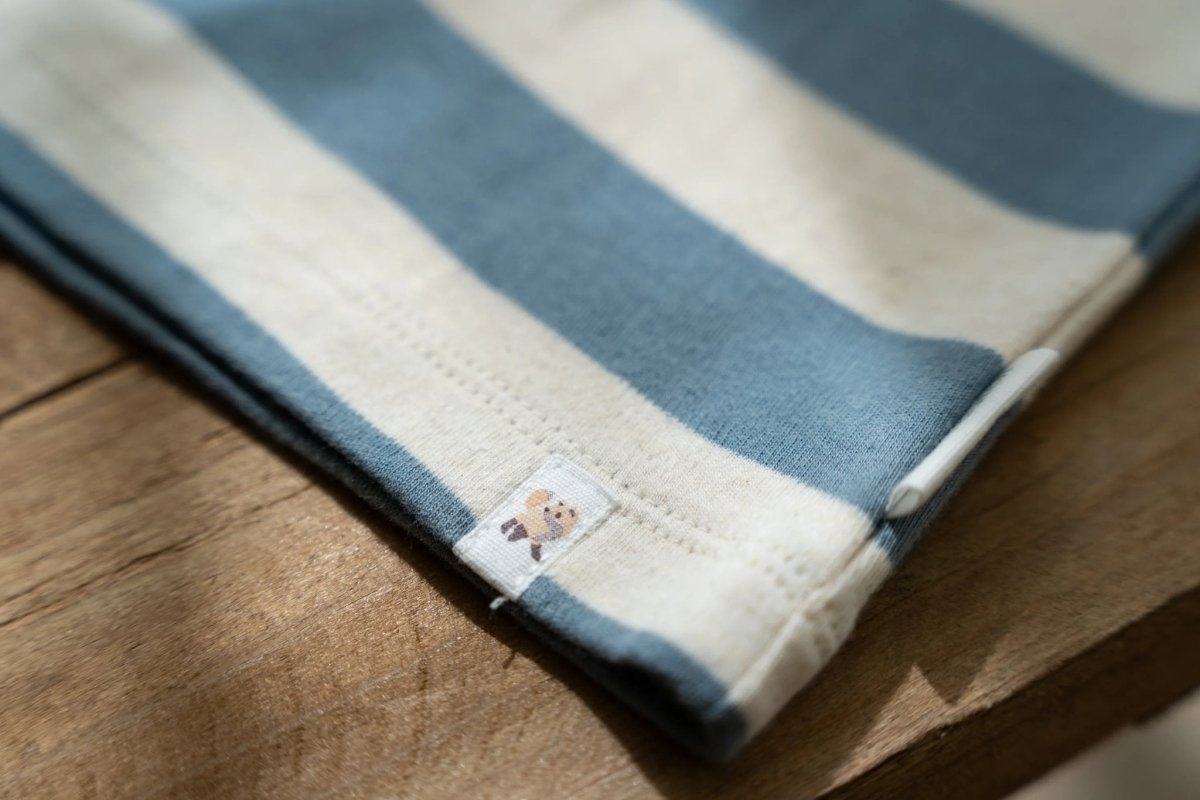Blau und sandfarben gestreift, aus Bio-Baumwolle, Öko-Tex zertifiziert. 100% Bio-Baumwolle