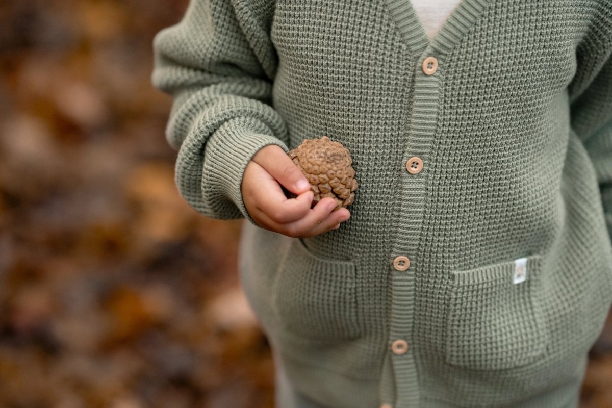 Warme Strickjacke, Knopfverschluss in Holzoptik, Vordertaschen, aus Bio-Baumwolle, Ökotex zertifiziert. 100% Bio-Baumwolle