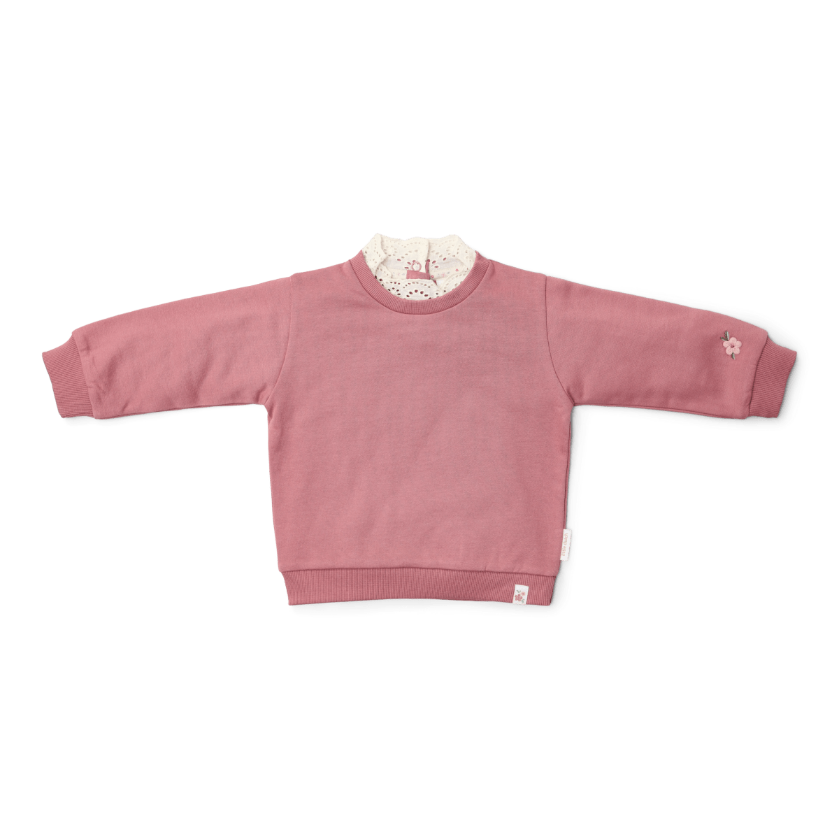 Warmer und weicher Pullover, kontrastierender Broderiekragen, florale Stickerei, aus Bio-Baumwolle, Öko-Tex zertifiziert. 100% Bio-Baumwolle.