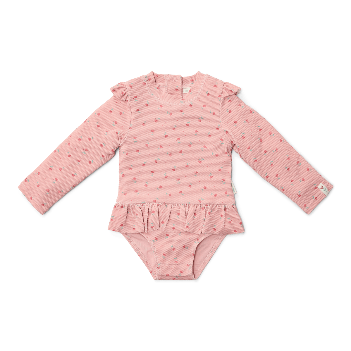 Dieser niedliche langärmelige Badeanzug hat eine hübsche Blush Pink Basis, die mit lauter kleinen Blumen verziert ist. Die Rüschen an den Schultern und der charmante Rüschenrock verleihen dem Badeanzug einen niedlichen und verspielten Look. Der praktische Druckknopfverschluss auf der Rückseite macht das An- und Ausziehen ganz einfach, auch wenn dein Kleines nass und sandig ist.