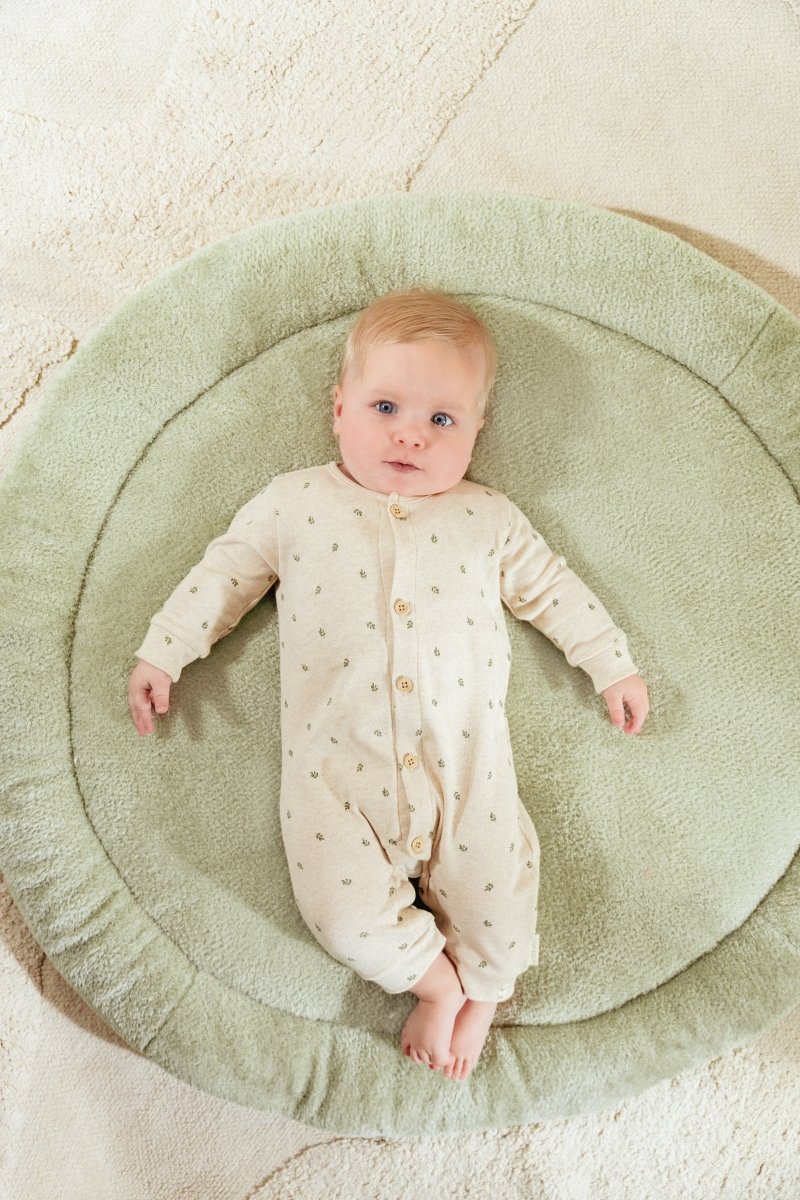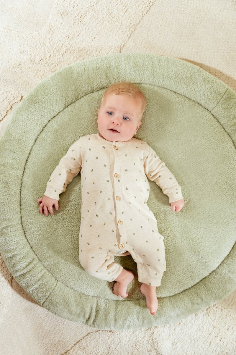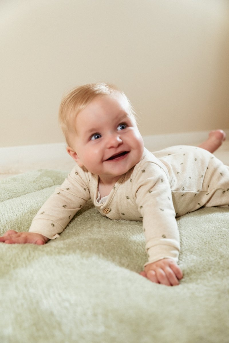 Genieße liebevolle Momente mit Stil! Dieser niedliche Strampelanzug in sandfarbener Melange ist mit einem süßen Druck aus kleinen grünen Blättern verziert. Zum einfachen An- und Ausziehen hat er eine Öffnung mit Druckknöpfen im Schritt und Knöpfen in Holzoptik auf der Vorderseite. Sie ist aus weicher Bio-Baumwolle gefertigt und bietet einen bequemen Sitz für dein Kind. Kombiniere sie mit einem Strampler für einen abgestimmten Look oder kombiniere sie mit anderen Artikeln aus der Little Farm Kollektion. Erhältlich in den Größen 44, 50, 56, 62, 68 und 74.