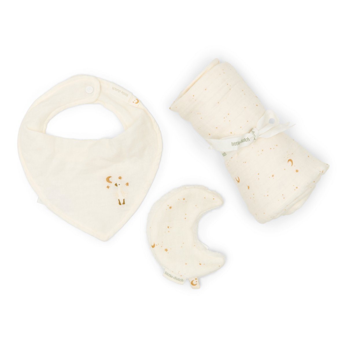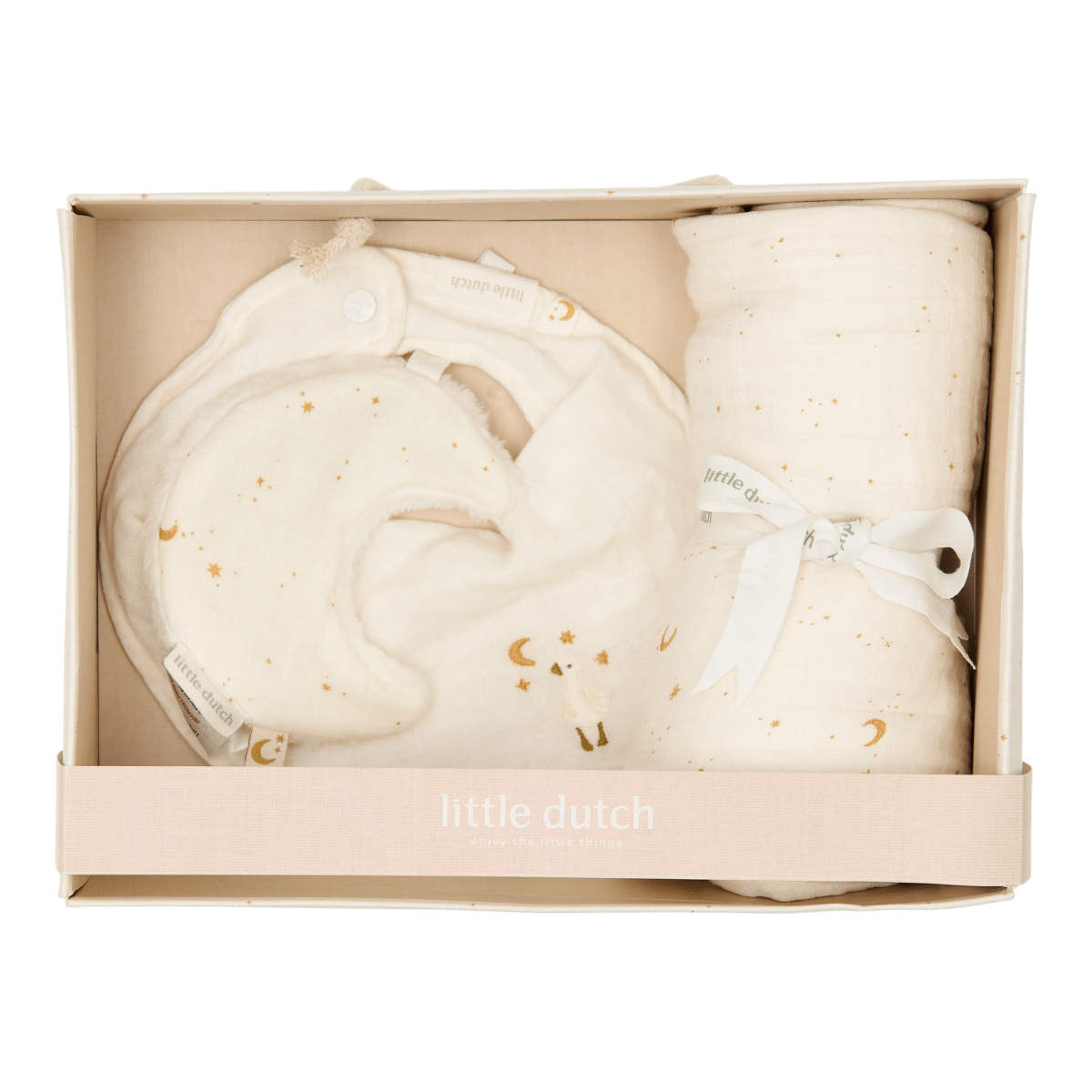 Verschenke das perfekte Geschenk mit dieser luxuriösen Geschenkbox! Das Set enthält 3 unverzichtbare Artikel: ein hydrophiles Tuch und ein SchnullerTuch mit dem bezaubernden Mond & Sterne-Aufdruck sowie ein Bandana in einem ruhigen Soft White mit niedlicher Stickerei. Hergestellt aus Musselin, vorgewaschen und geknittert, sind diese Tücher und das Bandana herrlich weich und super saugfähig. Die passende Box ist nicht nur perfekt zum Verschenken, sondern auch ideal, um Erinnerungen an dein Kind aufzubewahren (denn wir alle wissen, dass die ersten Hausschuhe irgendwo aufbewahrt werden müssen).