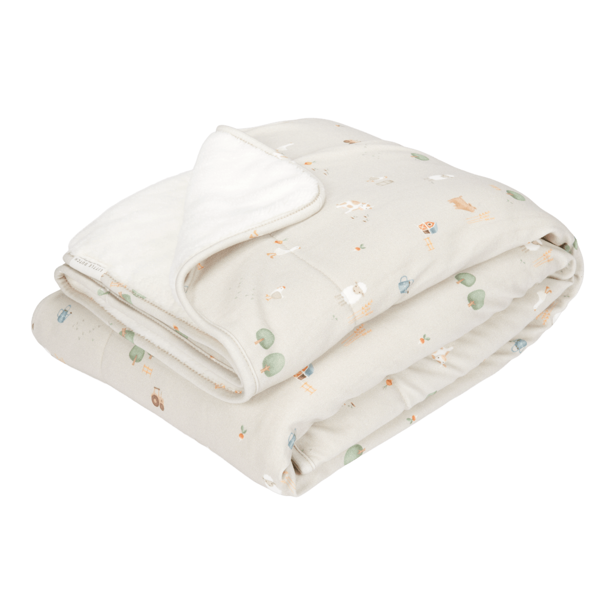 Eine wunderschöne Kinderbettdecke, die dein Kind wunderbar warm hält. Mit einem weichen Jersey-Stoff auf der einen und einem hübschen Teddy-Stoff auf der anderen Seite kann die Decke auch als Schal, Tagesdecke oder Spielmatte verwendet werden. Diese Decke aus der Little Farm-Kollektion ist mit einem schönen Bauernhof-Print verziert. ÊDas Beste von früher kombiniert mit der Frische von heute. Sie besteht aus 100% Baumwolle und hat einen TOG-Wert von 3,7. Du kannst sie einfach bei 30 Grad in der Waschmaschine waschen!