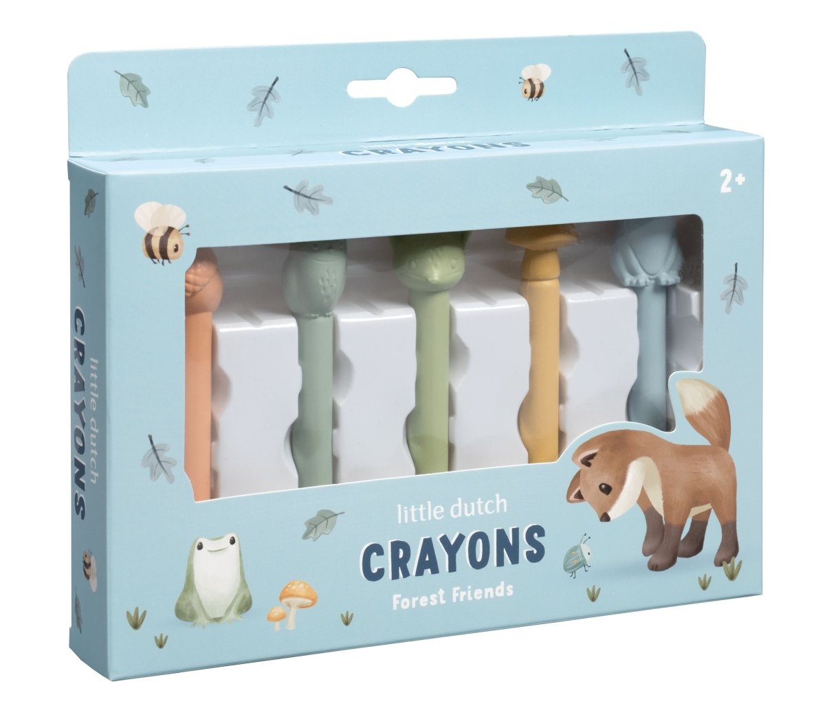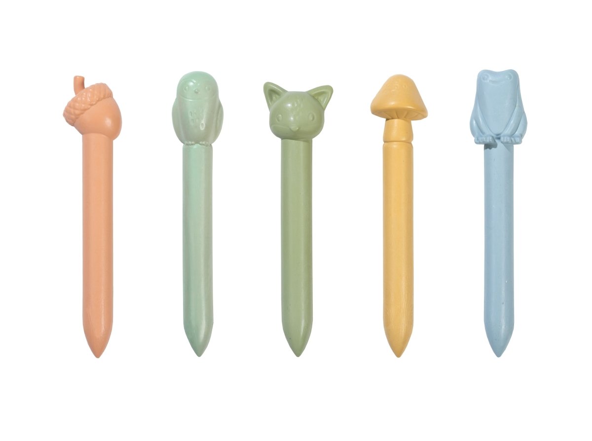 Bereit für ein kreatives Waldabenteuer? Benutze die Forest Friends Wachsmalstifte, um die schönsten Waldgeschichten auf Papier zu zeichnen! Dieses Set enthält 5 robuste Wachsmalkreiden in natürlichen Farben, jede mit einem lustigen Aufsatz in Form einer Eule, eines Fuchses, einer Eichel, eines Pilzes oder eines Frosches. Perfekt zum Zeichnen und für fantasievolle Spiele. Dank des stabilen Formats sind sie für kleine Kinderhände leicht zu halten. Du musst nicht fest drücken, um die schönsten Farben aufs Papier zu bringen. Geeignet für Kinder ab einem Alter von 2 Jahren.