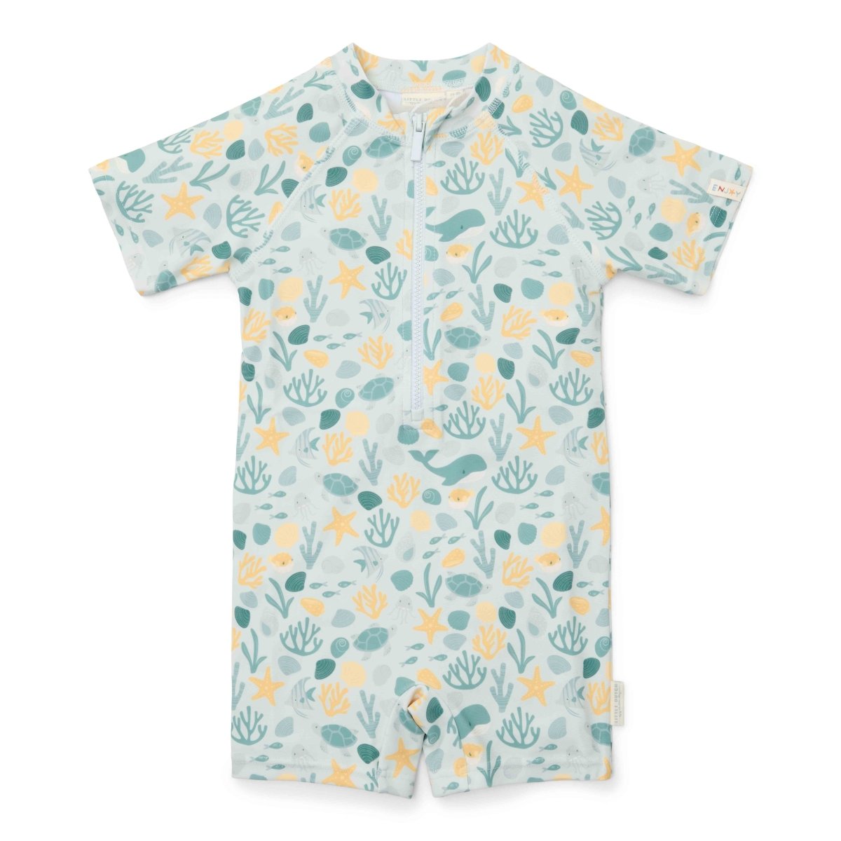 Dieser kurzärmelige Badeanzug hält dein Kind im Wasser warm und schützt es vor der Sonne. Das lustige Seashells-Design erweckt die Magie des Ozeans mit einer überschwänglichen Reihe von Muscheln, Seesternen, Korallen und Walen zum Leben.