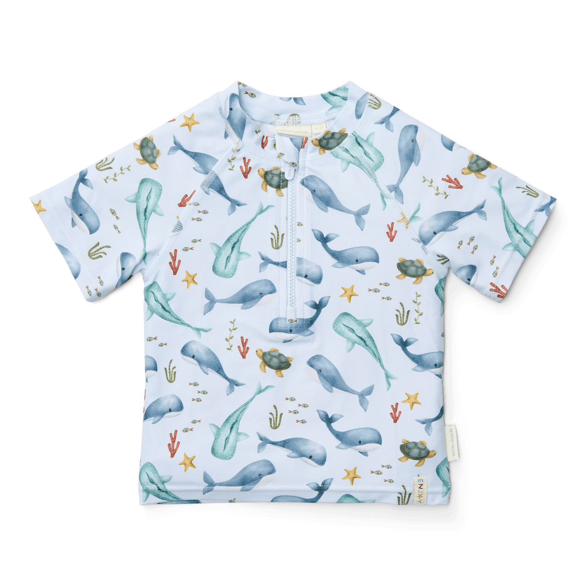 Das kurzärmelige Badeshirt wurde sorgfältig verarbeitet und bietet eine perfekte Mischung aus Stil, Funktionalität und Komfort. Der Reißverschluss erleichtert das An- und Ausziehen des Shirts, selbst wenn es nass ist. Das Ocean Sea Life Design mit Walen, die sich anmutig durch das ruhige hellblaue Wasser bewegen, verleiht jedem Strandabenteuer einen Hauch von Charme. Erhältlich in den Größen 62/68, 74/80, 86/92 und 98/104.