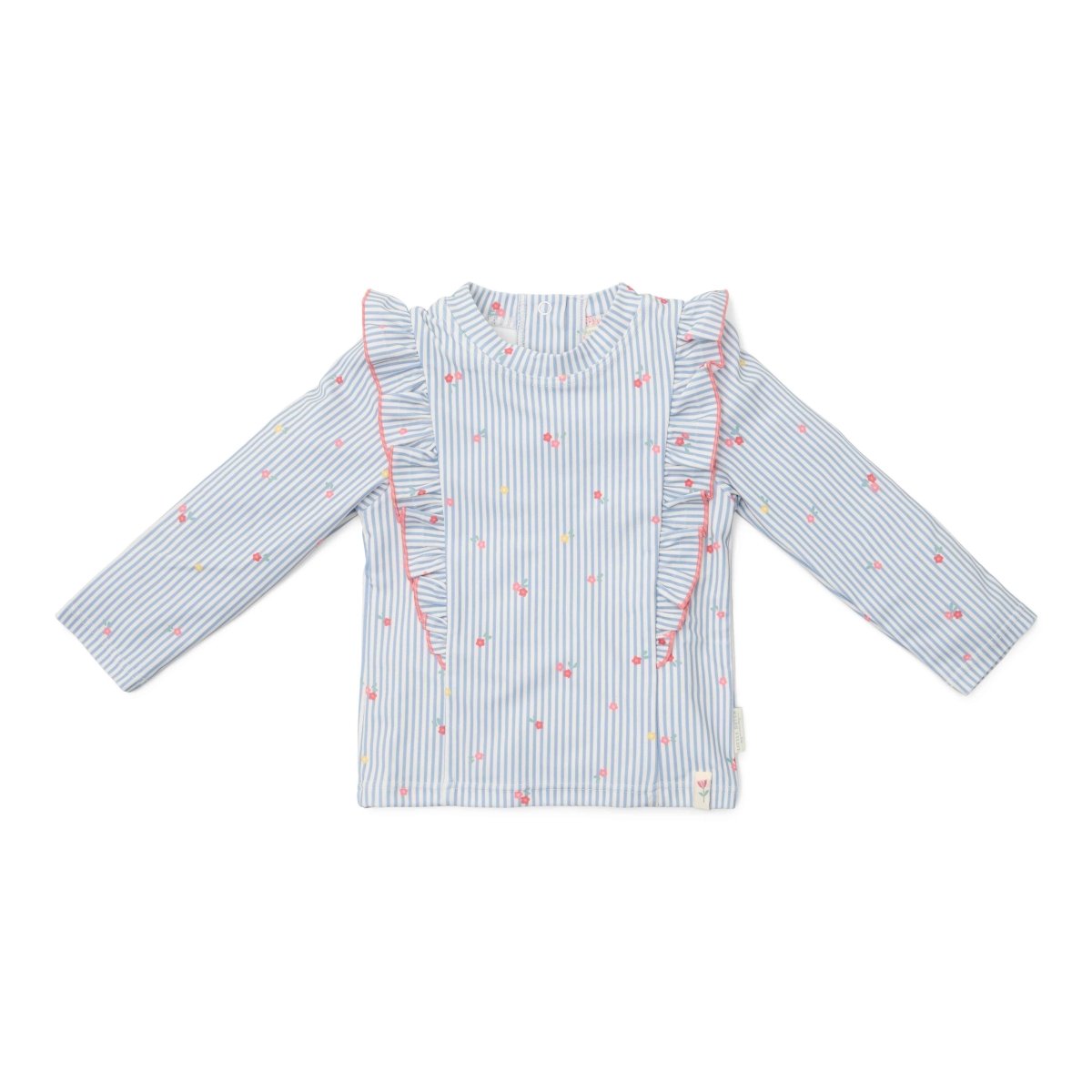 Dieses hübsche langärmelige Badeshirt hat ein zartes Design aus blauen und weißen Streifen, die mit winzigen rosa Blumen verziert sind. Die voluminösen Rüschen sorgen für einen romantischen Look und verlaufen vom Rücken zur Vorderseite. Dank des praktischen Druckknopfverschlusses auf der Rückseite lässt sich das Schwimmshirt leicht an- und ausziehen, auch wenn dein Kind nass und sandig ist. Dieses niedliche Badeshirt ist in den Größen 62/68, 74/80, 86/92 und 98/104 erhältlich, passend für jeden kleinen Seestern.