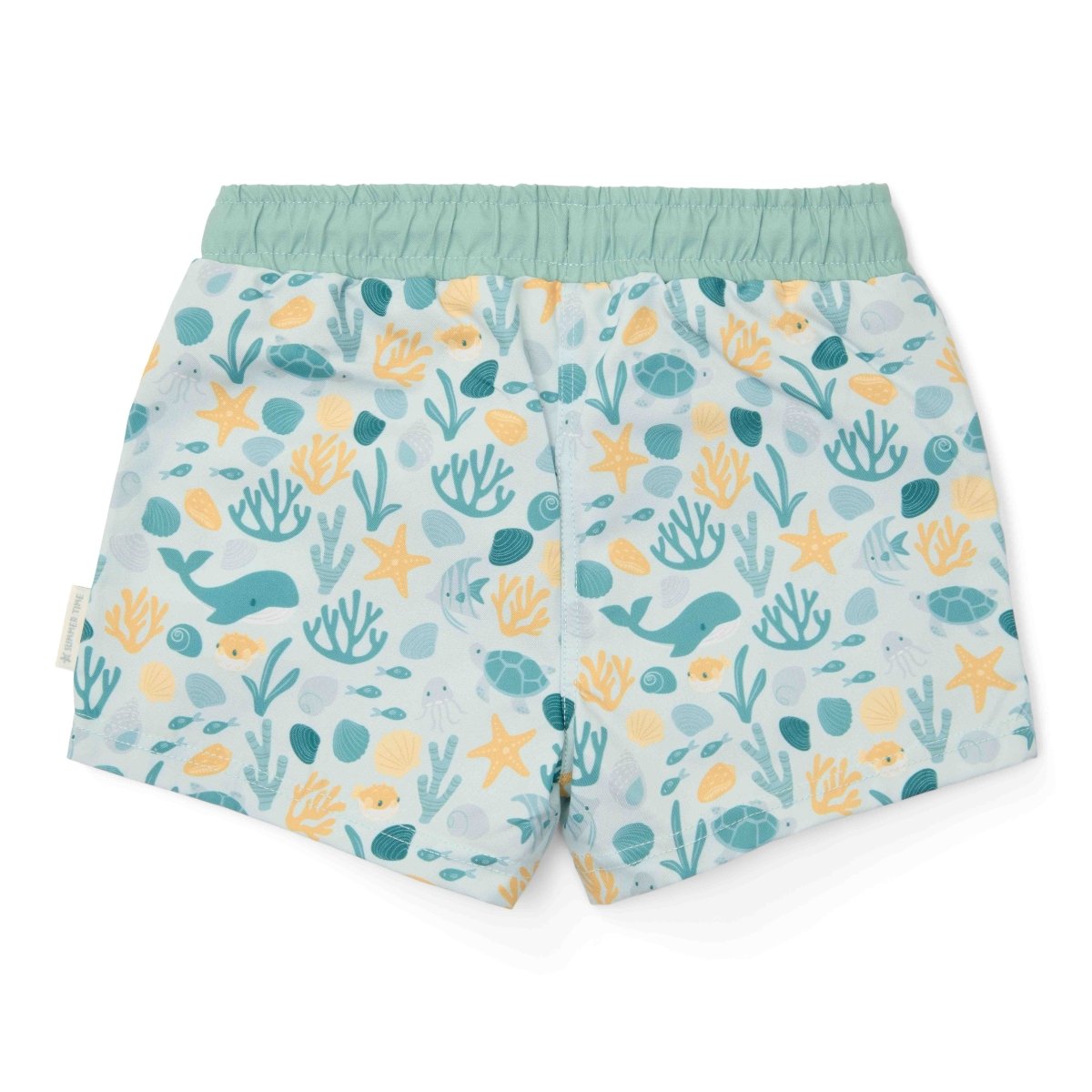 Das fröhliche Seashells-Design mit Seesternen, Korallen und Walen verleiht diesen Badeshorts einen verspielten maritimen Look. Die weite Passform und der elastische Bund mit Kordelzug sorgen für dauerhaften Komfort im und außerhalb des Wassers. Erhältlich in den Größen 62/68, 74/80, 86/92 und 98/104.