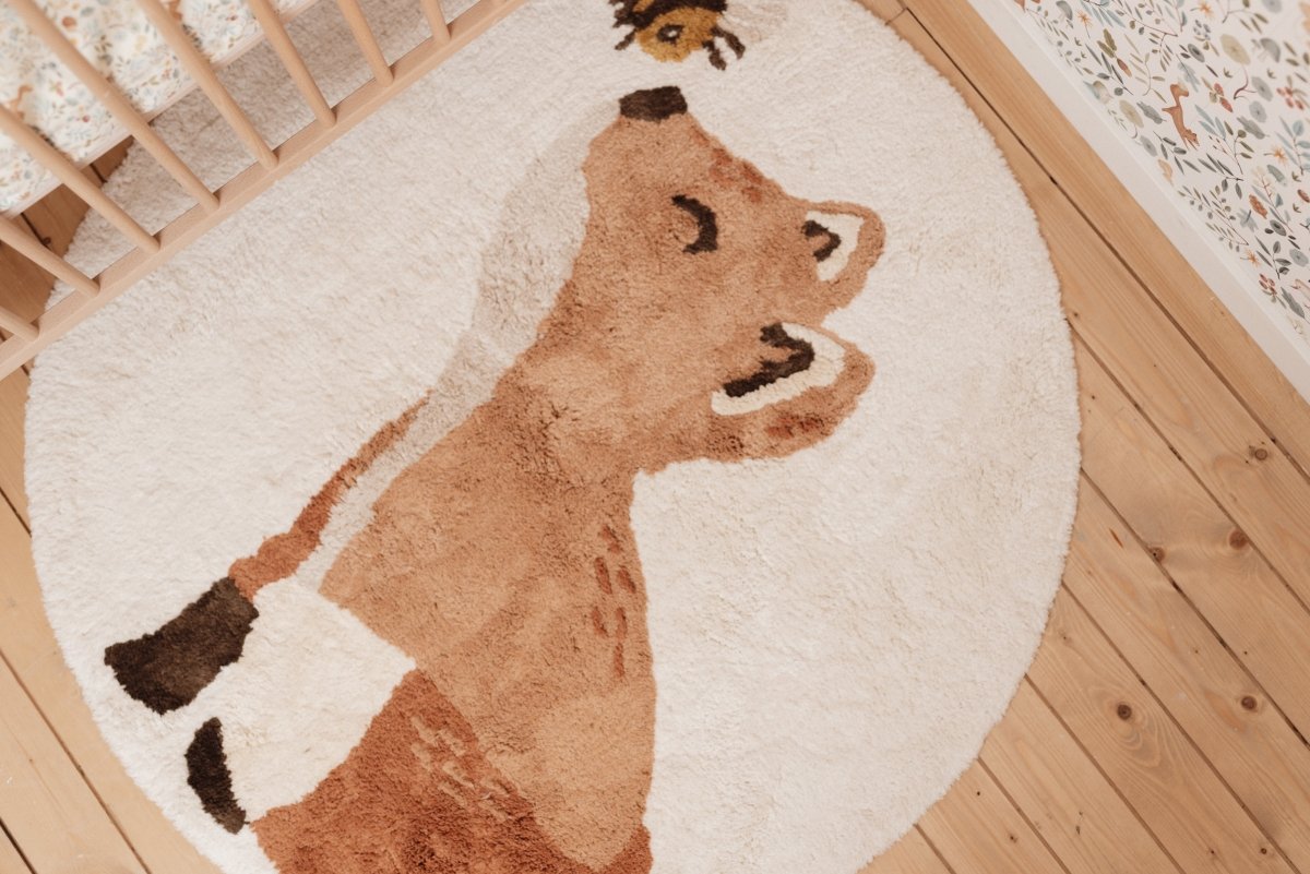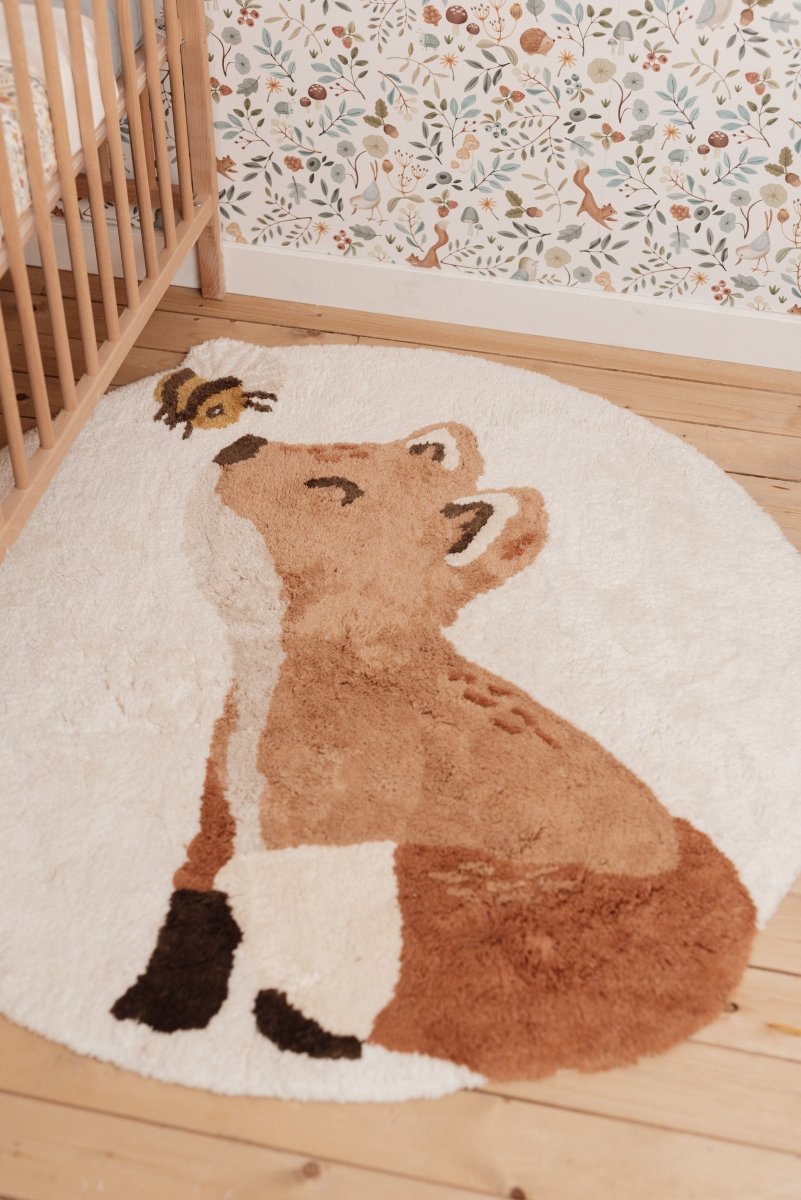 Gebe dem Kinderzimmer Wärme mit einem Teppich von Little Dutch! Dieser Teppich in Form eines niedlichen Fuchses hat eine beige Grundfarbe und ist mit einer Biene auf der Nase verziert. Der Teppich bringt eine verspielte und gemütliche Atmosphäre in den Raum. Er besteht aus 100% Bio-Baumwolle und ist mit einer rutschfesten Latexrückseite ausgestattet, die sowohl in der Waschmaschine als auch im Trockner leicht zu reinigen ist. Die schwerere Baumwollqualität verleiht ihm ein luxuriöses Aussehen, während der attraktive Preis ihn zu einer perfekten Wahl für jede Einrichtung macht.