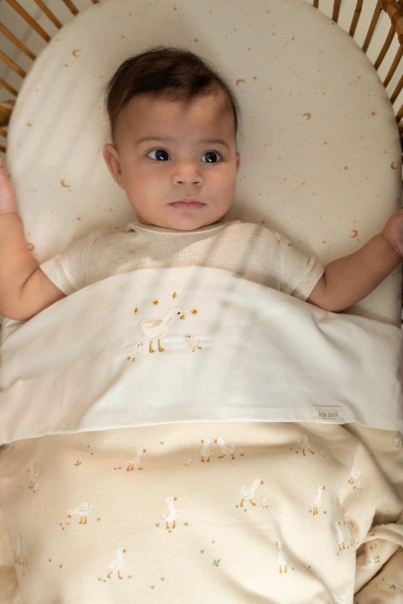 Eine wunderschöne Wiegedecke, die dein Kleines wunderbar warm hält. Mit weichem Jersey auf der einen und kuscheligem Fleece auf der anderen Seite ist diese Decke vielseitig einsetzbar: Sie kann als Schal, Bettdecke oder sogar als Spielmatte verwendet werden. Diese Decke aus der Little Goose Kollektion ist mit niedlichen kleinen Gänsen verziert und verbindet das Beste aus der Nostalgie mit einem frischen, modernen Touch. Sie besteht aus 100% Bio-Baumwolle und hat einen großzügigen TOG-Wert von 2,5, perfekt für kalte Nächte. Und praktisch: Du kannst sie einfach bei 30 Grad in der Maschine waschen!
