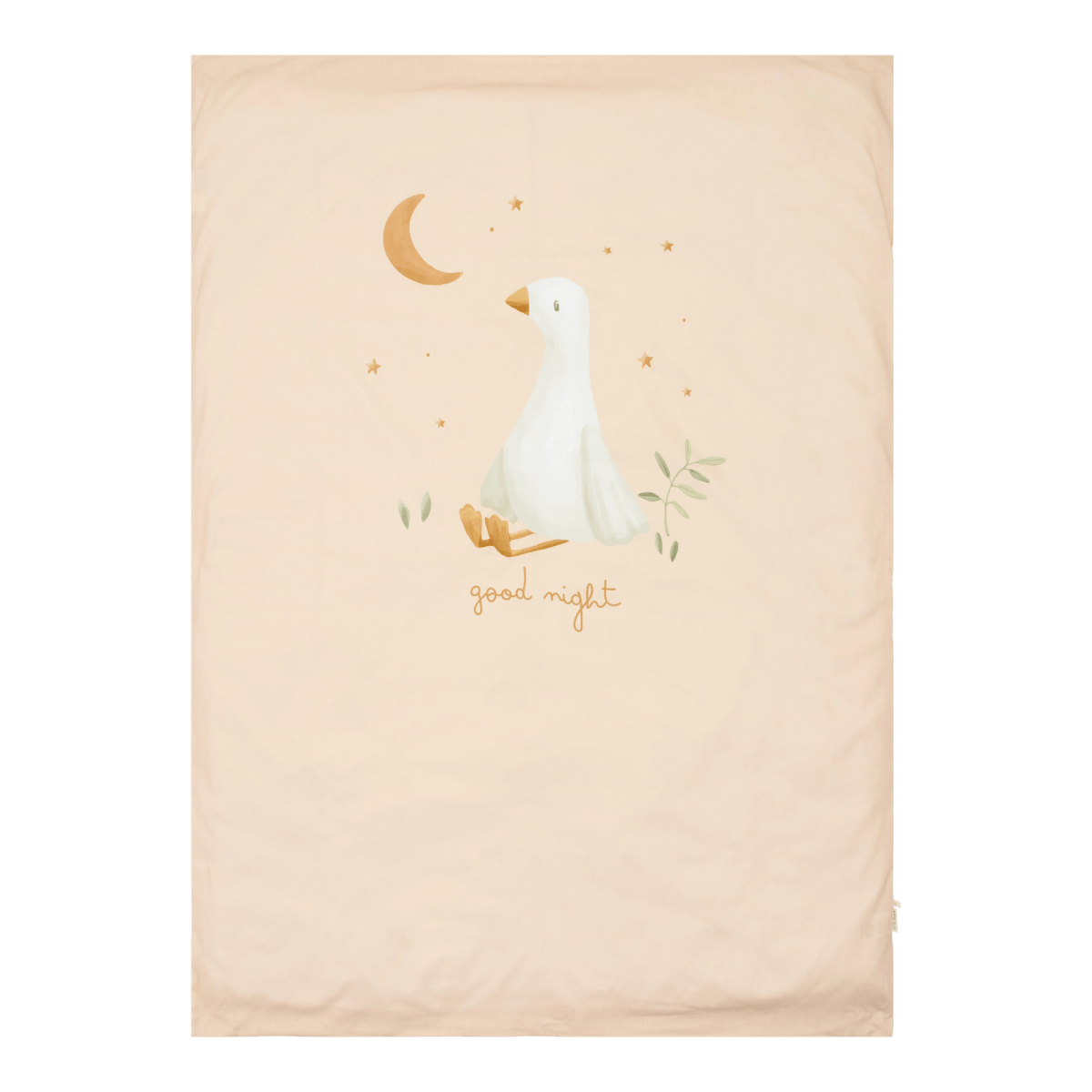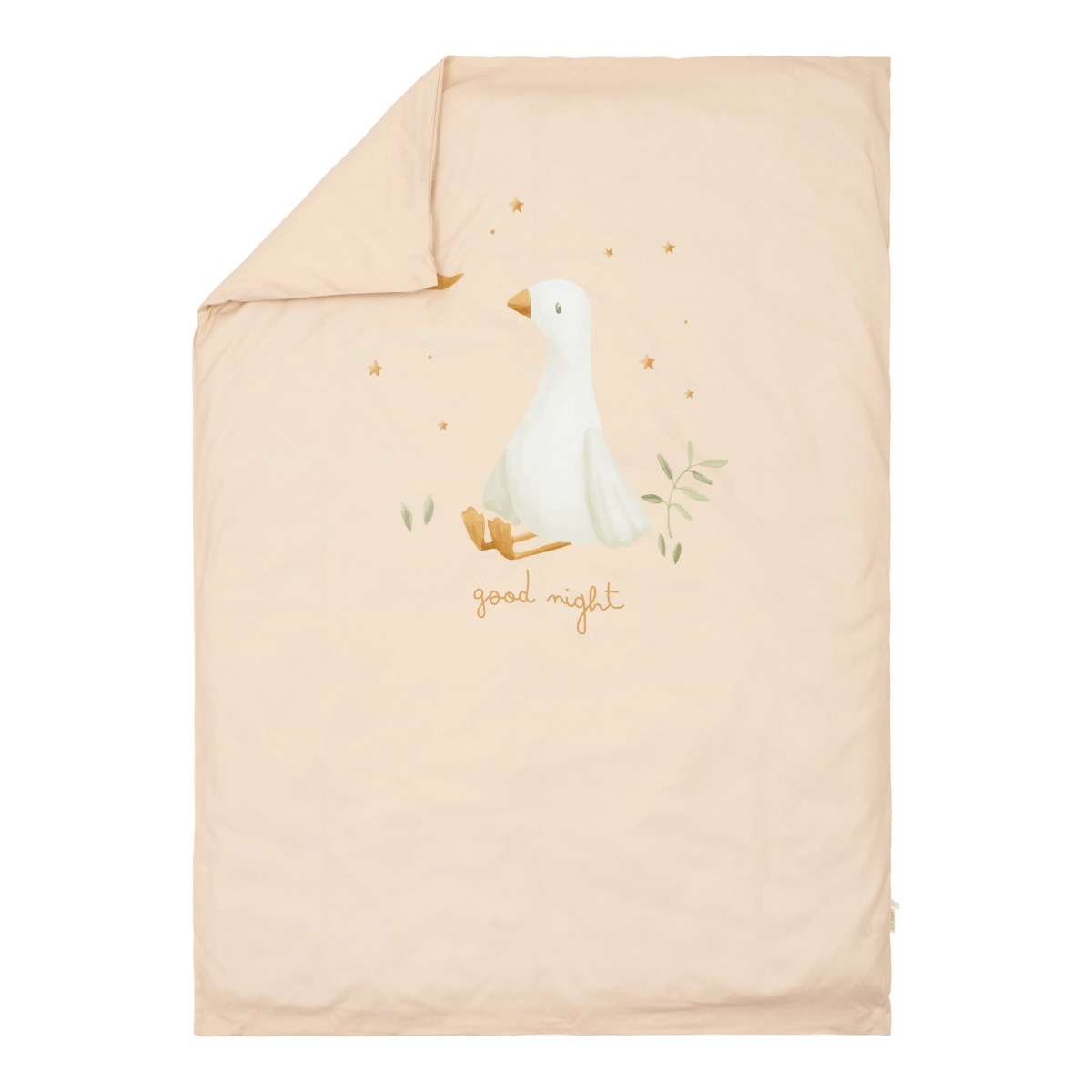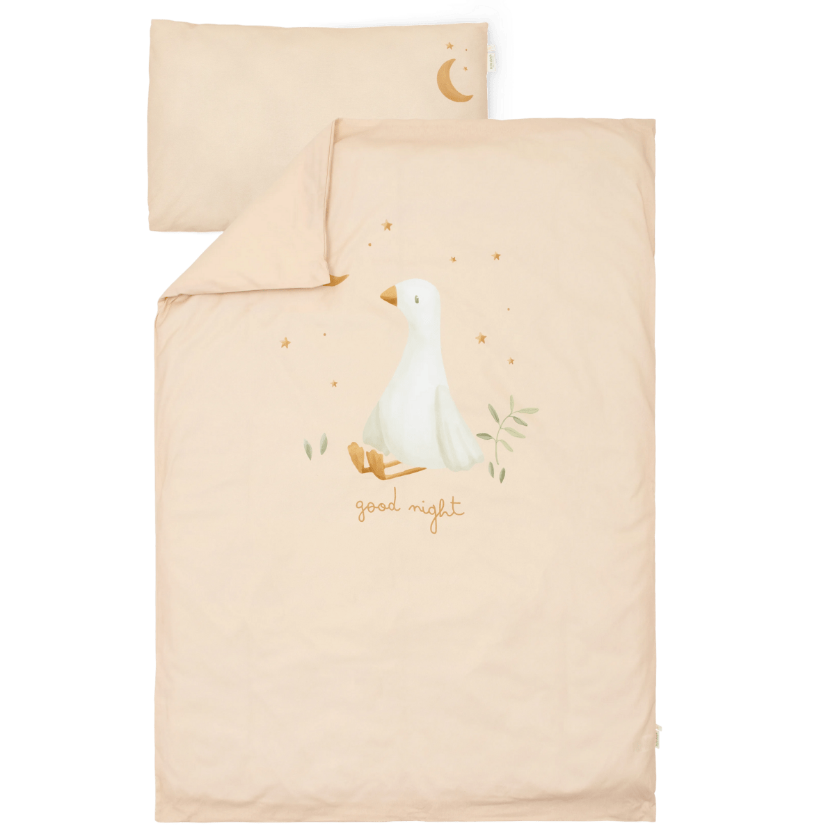 Verleihe dem Kinderzimmer einen stilvollen und gemütlichen Touch mit einem schön gemachten Bett. Dieser Bettbezug wird dein Kind zu traumhaften Abenteuern entführen. Er ist aus 100 % Bio-Baumwolle gefertigt, fühlt sich wunderbar weich an und ist atmungsaktiv - perfekt für einen angenehmen Schlaf. Die hübsche Farbe, kombiniert mit den süßen Gänsen, sorgt für einen verspielten und beruhigenden Look. Der Bettbezug hat eine Größe von 110 x 140 cm und einen passenden 40 x 60 cm großen Kopfkissenbezug. Beide sind sorgfältig verarbeitet und so gestaltet, dass dein Kleines einen wunderbaren Schlaf hat. Eine perfekte Wahl für kleine Gänseliebhaber!