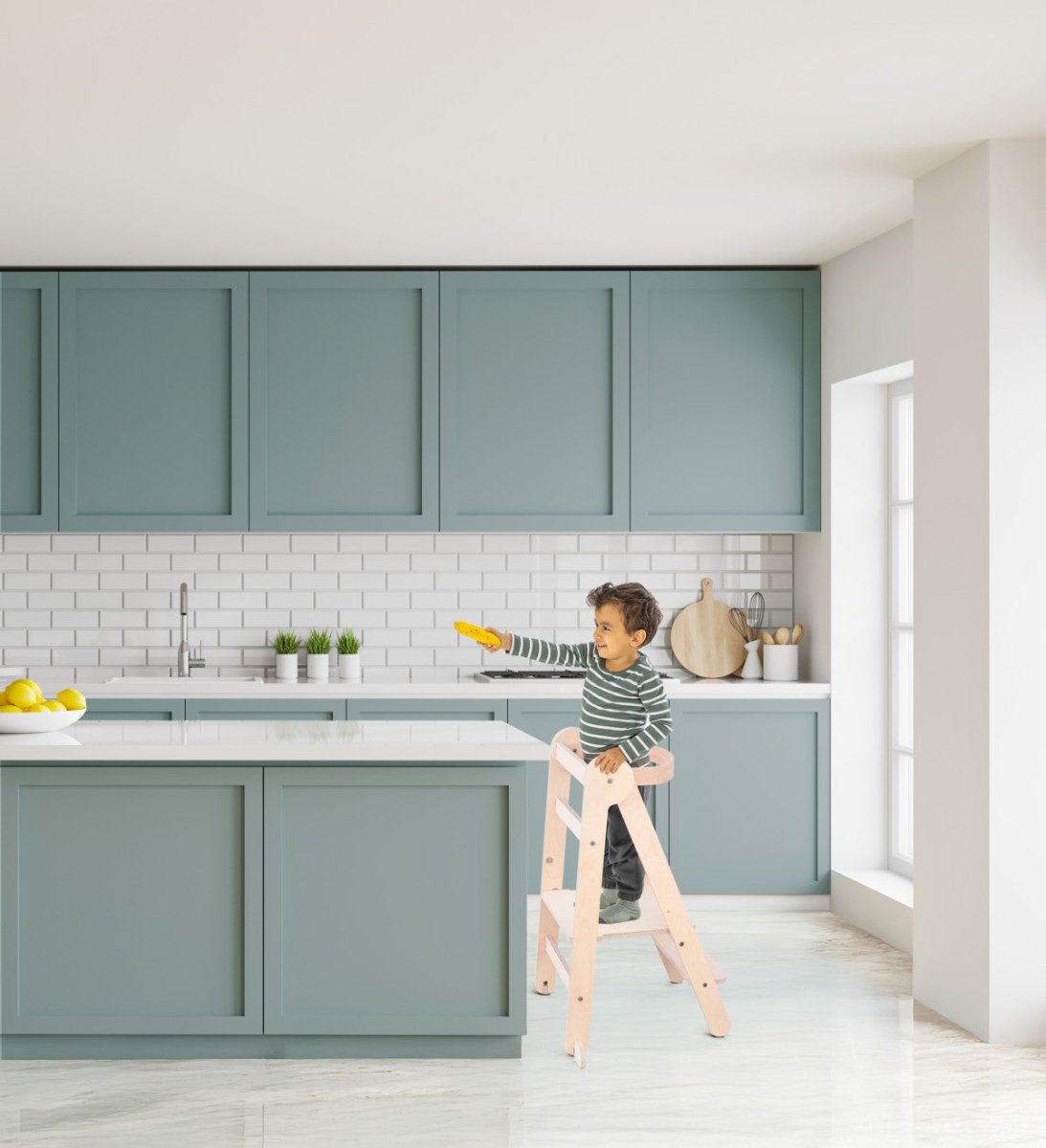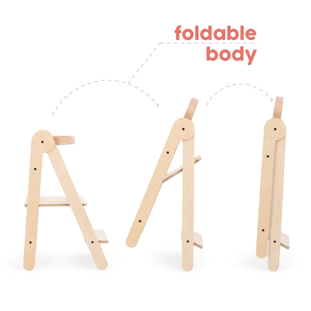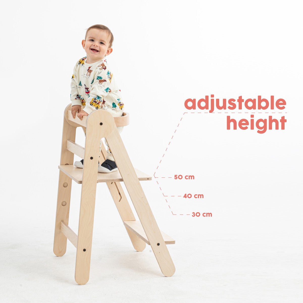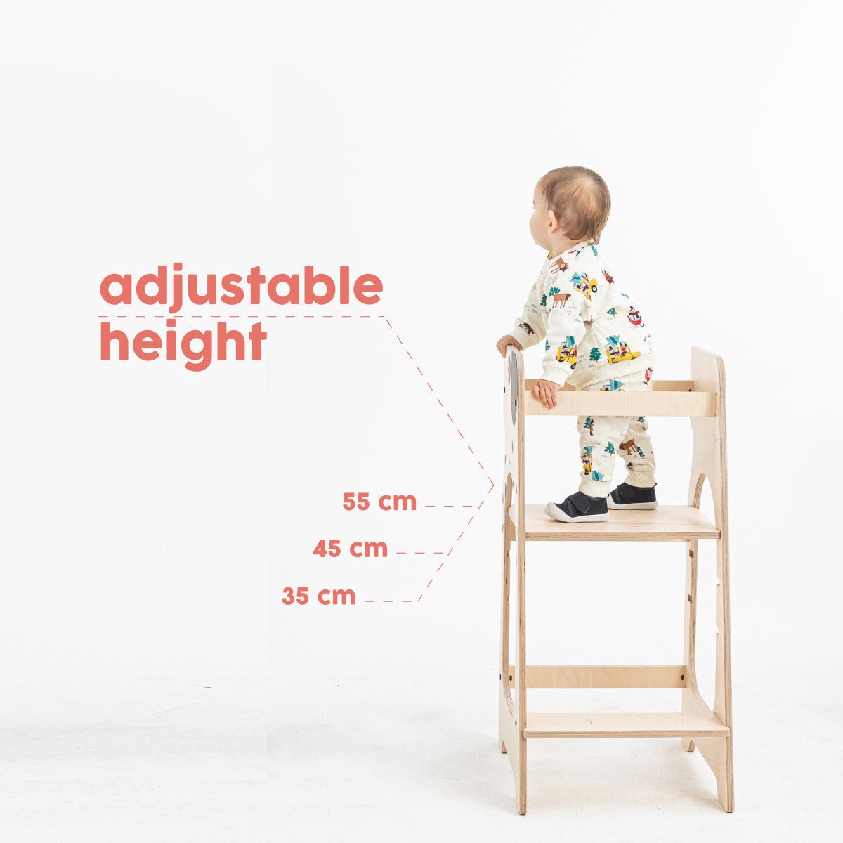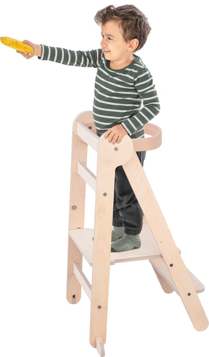 Dank seiner drei verstellbaren Höhen wächst dieser Lernturm mühelos mit deinem Kind mit, von 12 Monaten bis etwa 5 Jahren. Er besteht aus natürlichem Holz, insbesondere aus Birke, und enthält daher keine Chemikalien. Eine sichere und umweltfreundliche Wahl also!