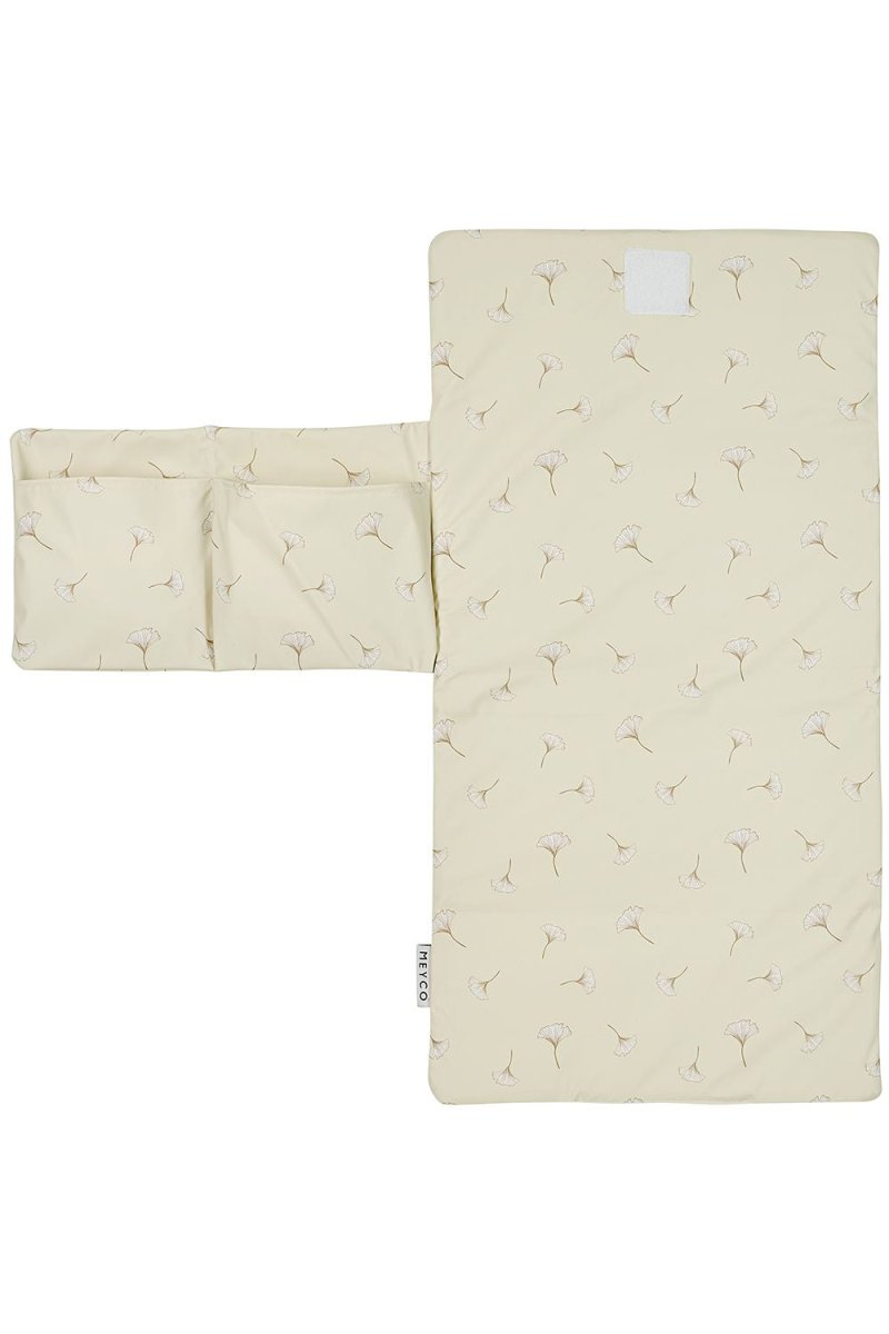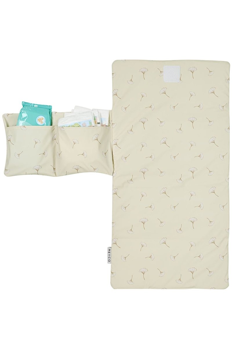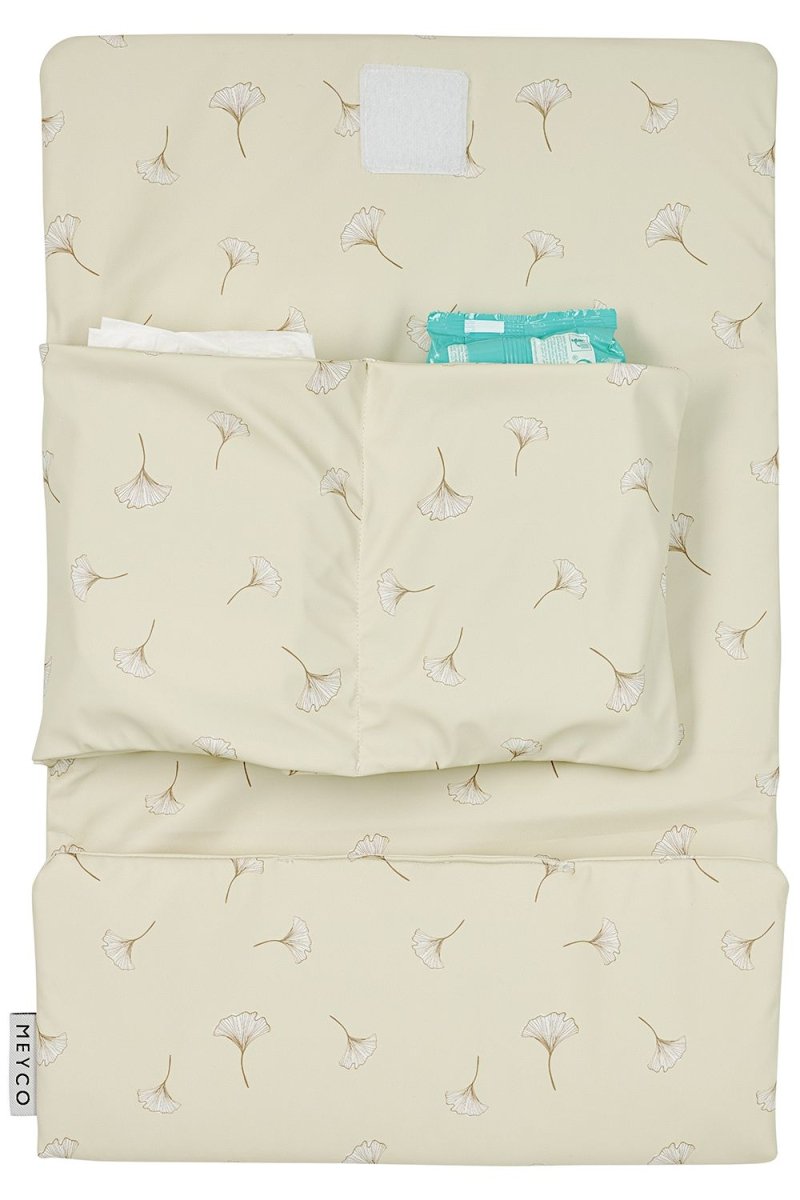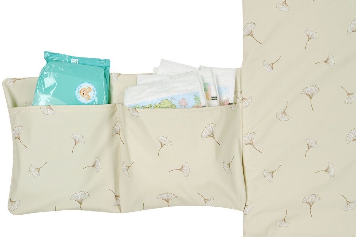 Die Wickelauflage hat einen schönen, ruhigen Druck mit Ginkgoblättern. So gehst du stilvoll mit deinem kleinen Abenteurer aus!