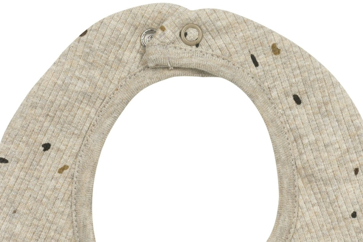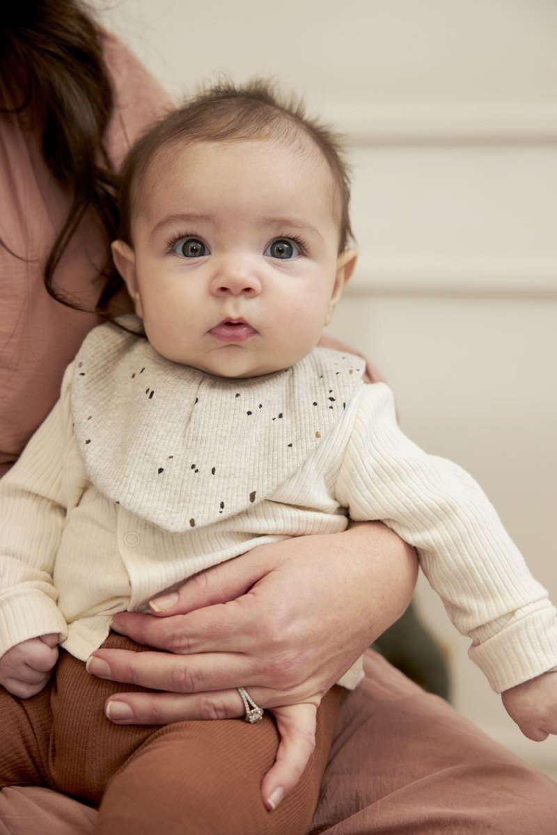 Die Bandana-Lätzchen bestehen aus 95% weicher Baumwolle und 5% Elastan. Der trendige Rippenstoff sorgt für einen lustigen Twist und der Stoff ist wunderbar weich und dehnbar. Die Lätzchen sind in verschiedenen Melange-Farben erhältlich und haben den Aufdruck Mini Spot. Der Druck ist minimalistisch, verleiht dem Halstuch aber trotzdem einen sehr schicken Look und du kannst es ganz einfach mit deinem kompletten Baby-Outfit kombinieren.