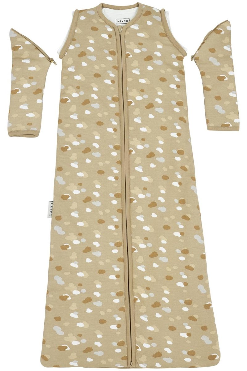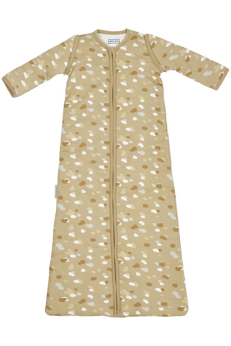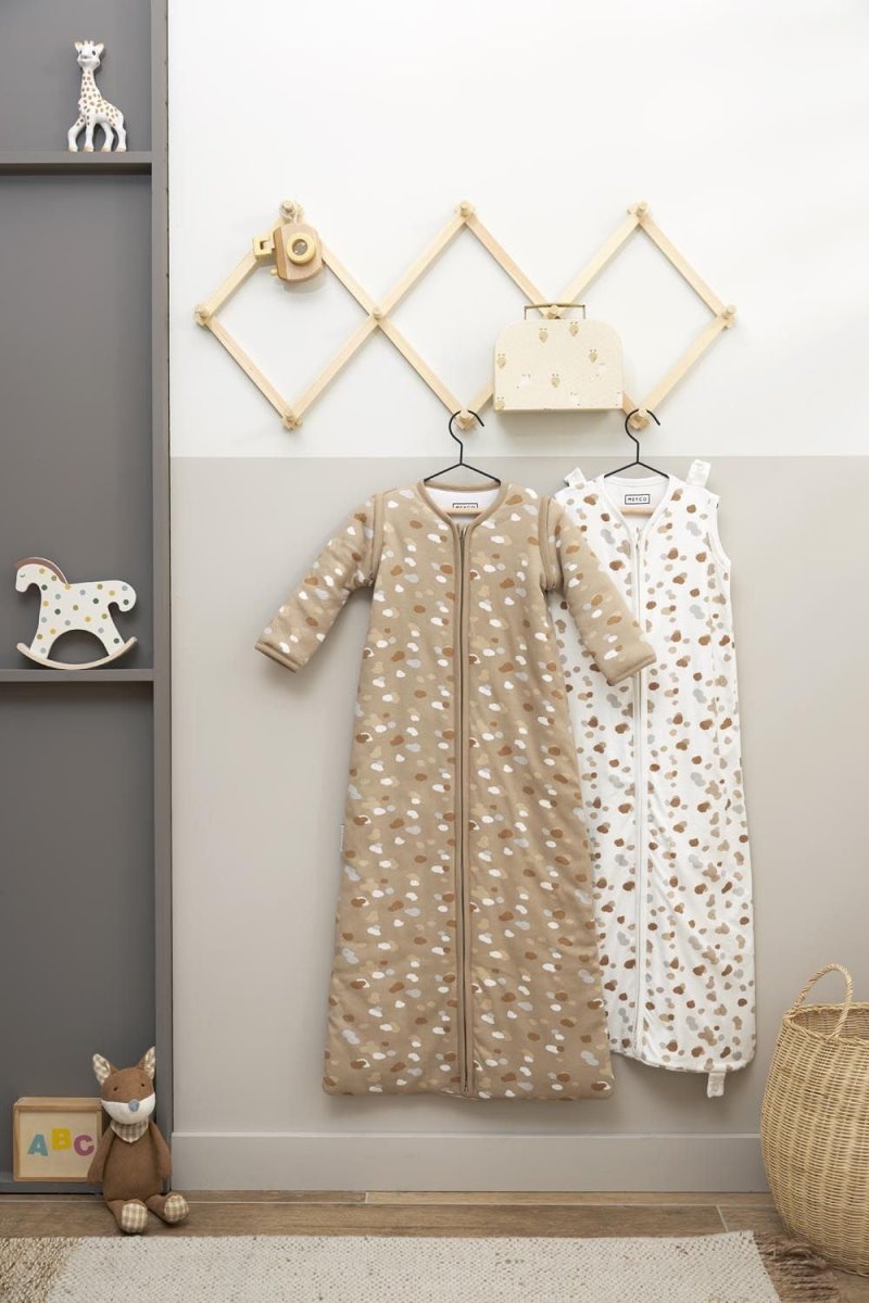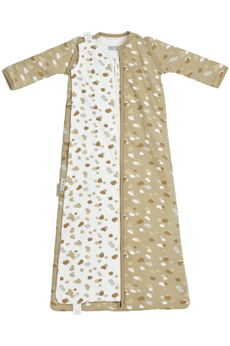 Der Innen- und Außenschlafsack haben zusammen einen TOG-Wert von 3.0. Je höher der TOG-Wert, desto wärmer. Der Schlafsack hat einen sicheren Sitz, da er am Hals und an den Armen eng anliegt. Der Stains-Print besteht aus niedlichen Flecken in ruhigen Farben und du kannst ihn perfekt mit der kompletten
