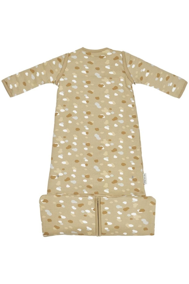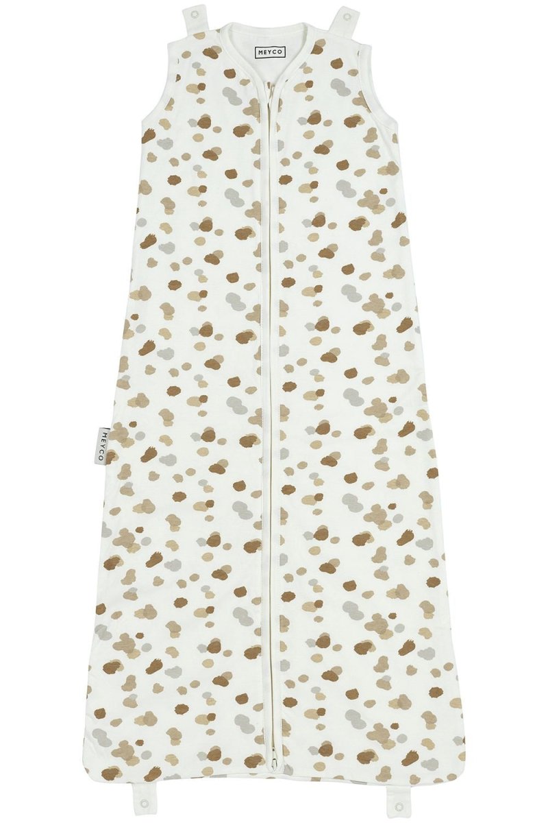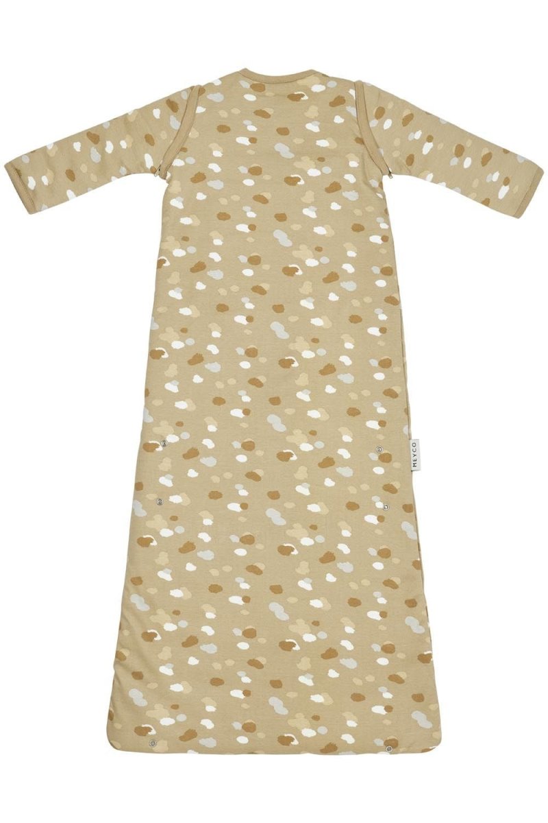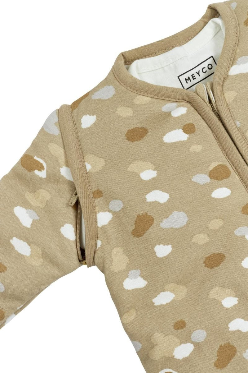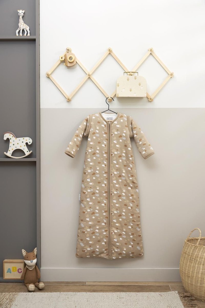 Der Innen- und Außenschlafsack haben zusammen einen TOG-Wert von 3.0. Je höher der TOG-Wert, desto wärmer. Der Schlafsack hat einen sicheren Sitz, da er am Hals und an den Armen eng anliegt. Der Stains-Print besteht aus niedlichen Flecken in ruhigen Farben und du kannst ihn perfekt mit der kompletten