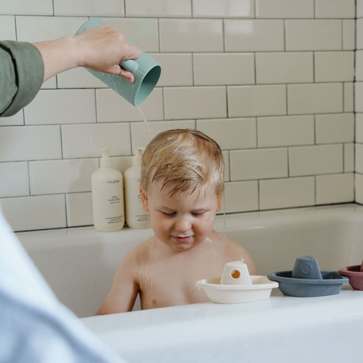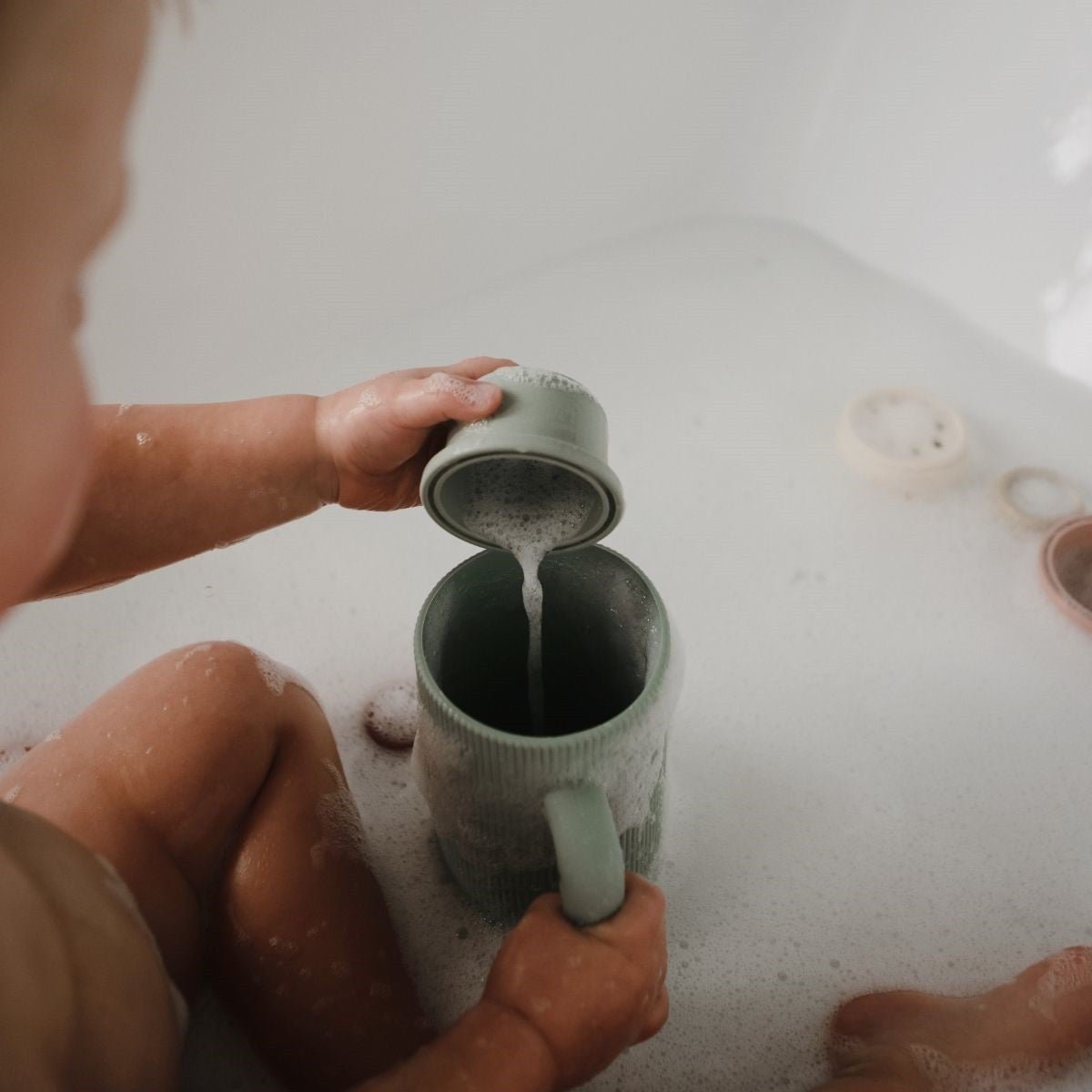 Verwandle deine Abendroutine mit dem Mushie Badespülbecher, der Schaum und Blasen mühelos wegspült.