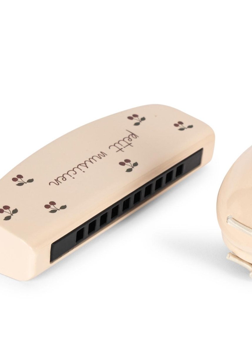 Packungsinhalt: Mundharmonika, Maracas und Handmagnete