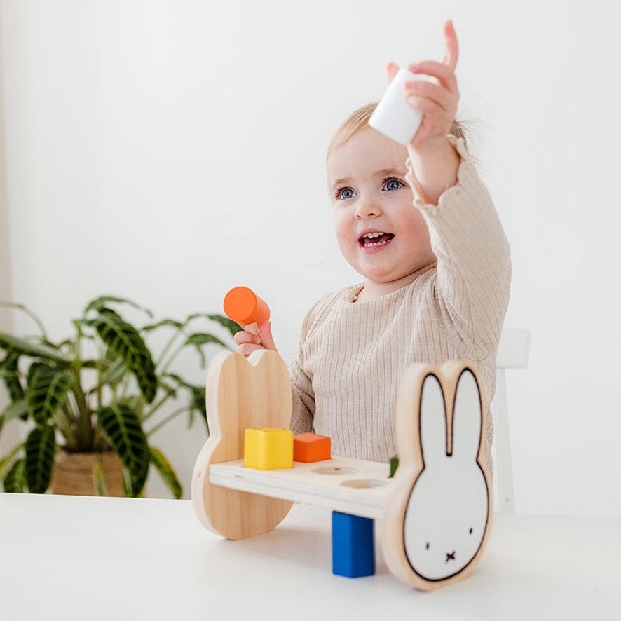 Mit dem mitgelieferten Holzhammer schlägt dein Kind ganz einfach die 5 verschiedenen Formen von Stöcken in die Hammerbank. Du kannst die bunten Stäbchen leicht entfernen, damit dein Kleines die Hammerbank immer wieder benutzen kann. So wird es nie langweilig!